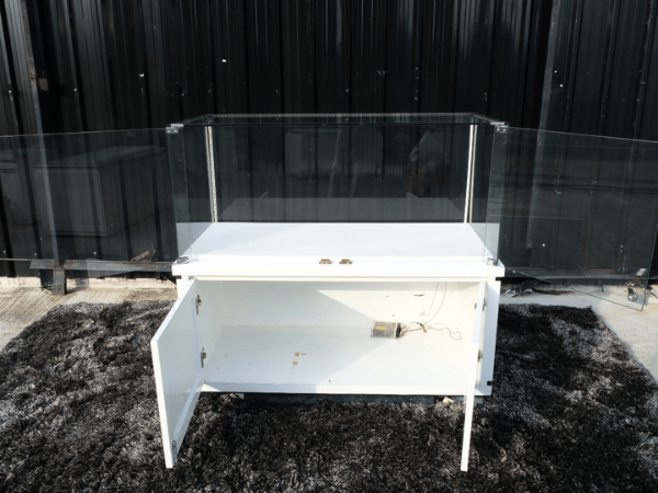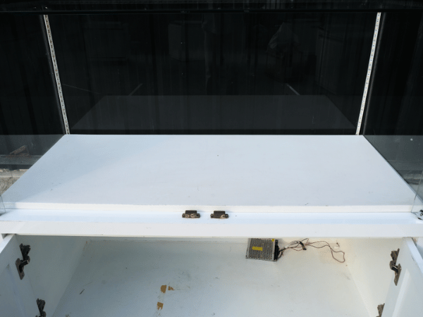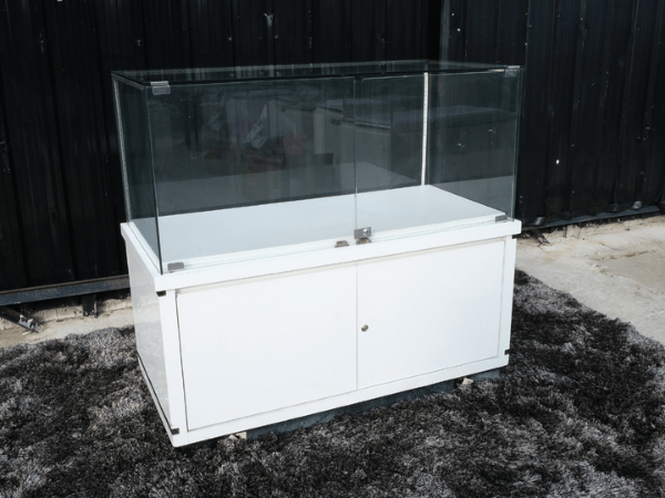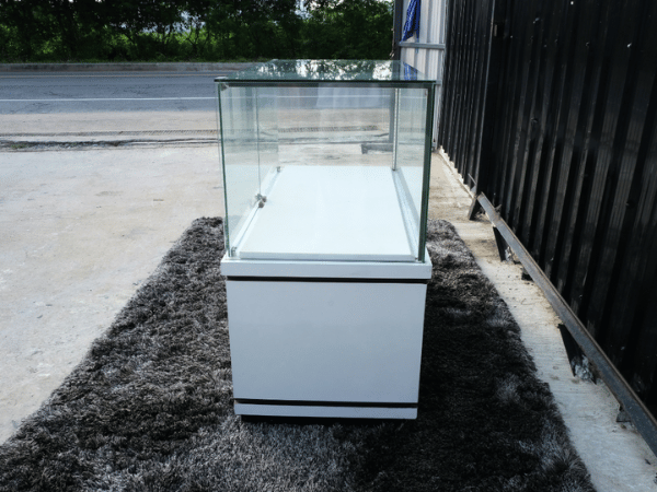 ตู้จิวเวลรี่ ตู้กระจกโชว์สินค้า ทรงสี่เหลี่ยมผืนผ้า ประตูกระจกบานเปิด ฐานไม้สีขาวลายหินอ่อน (1)