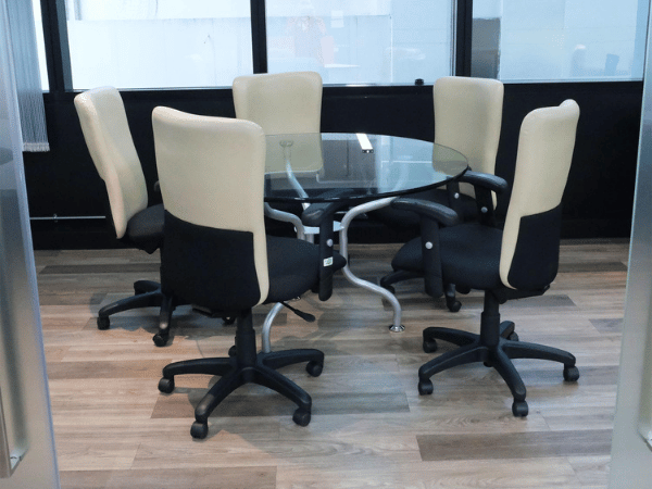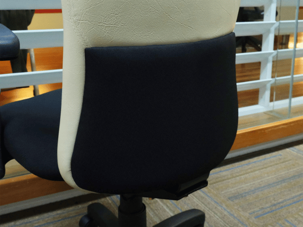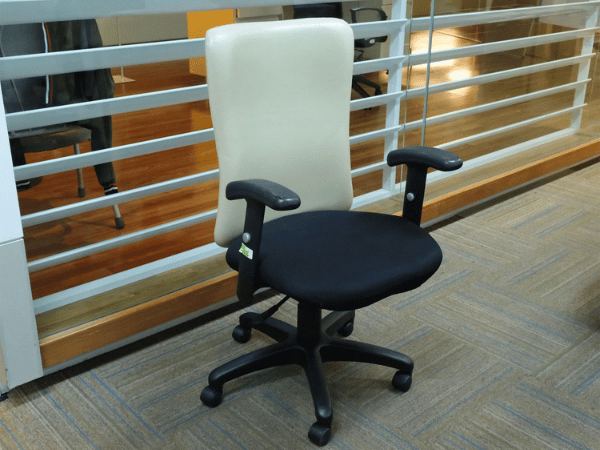 เก้าอี้สำนักงาน พนักพิงหนังสีครีม เบาะผ้าสีดำ มีแขน