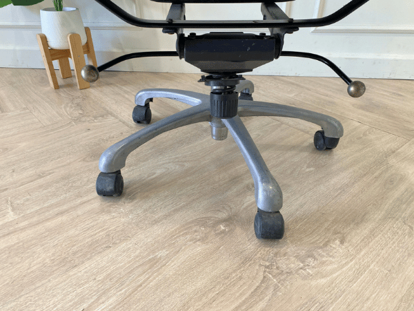 带轮办公椅,蓝色网布椅背,布艺坐垫,黑色钢制椅腿
