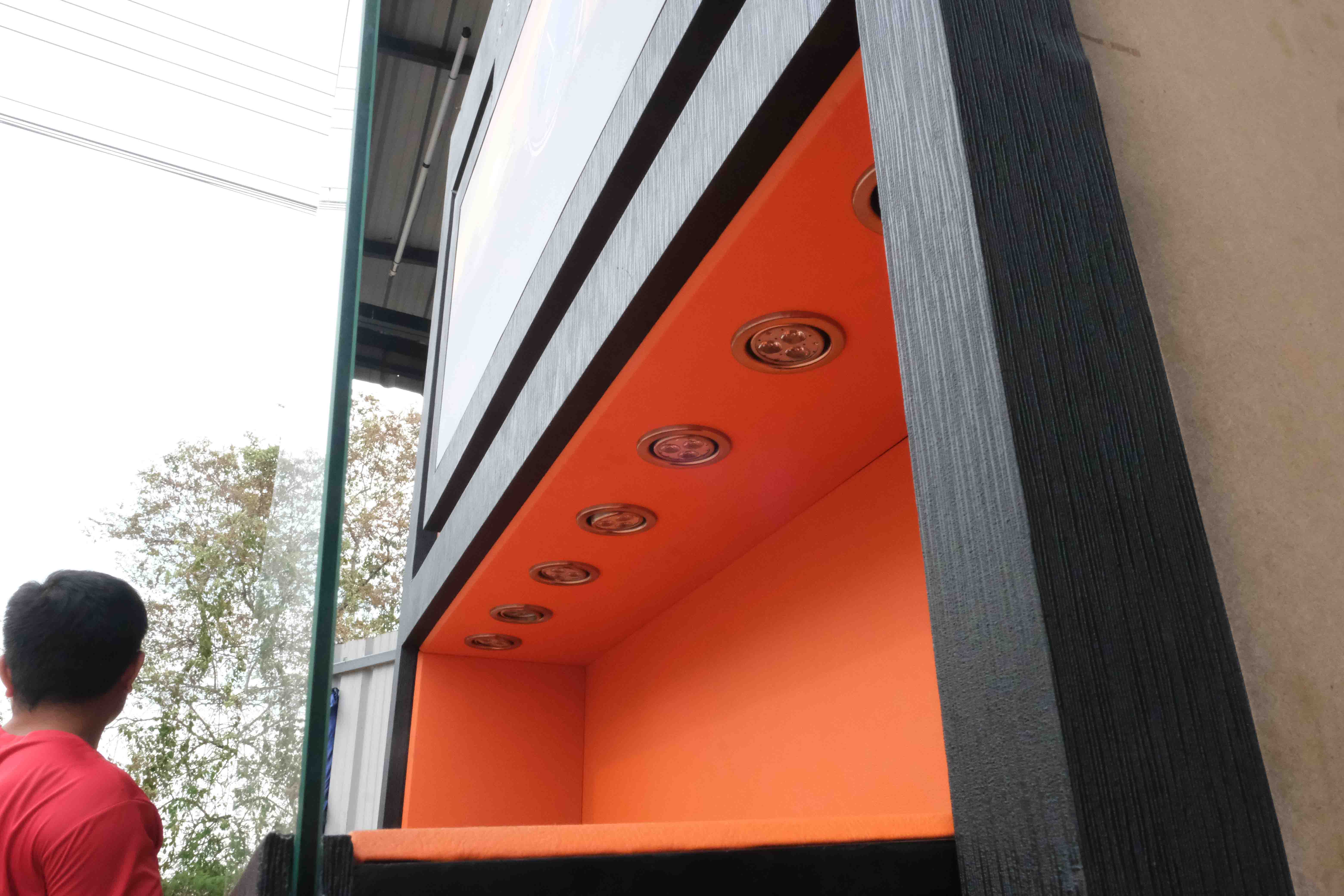 珠宝柜、玻璃柜展示产品底座采用不锈钢刻花玻璃图案设计,有一个带有 1 个灰色石纹门的储物柜。