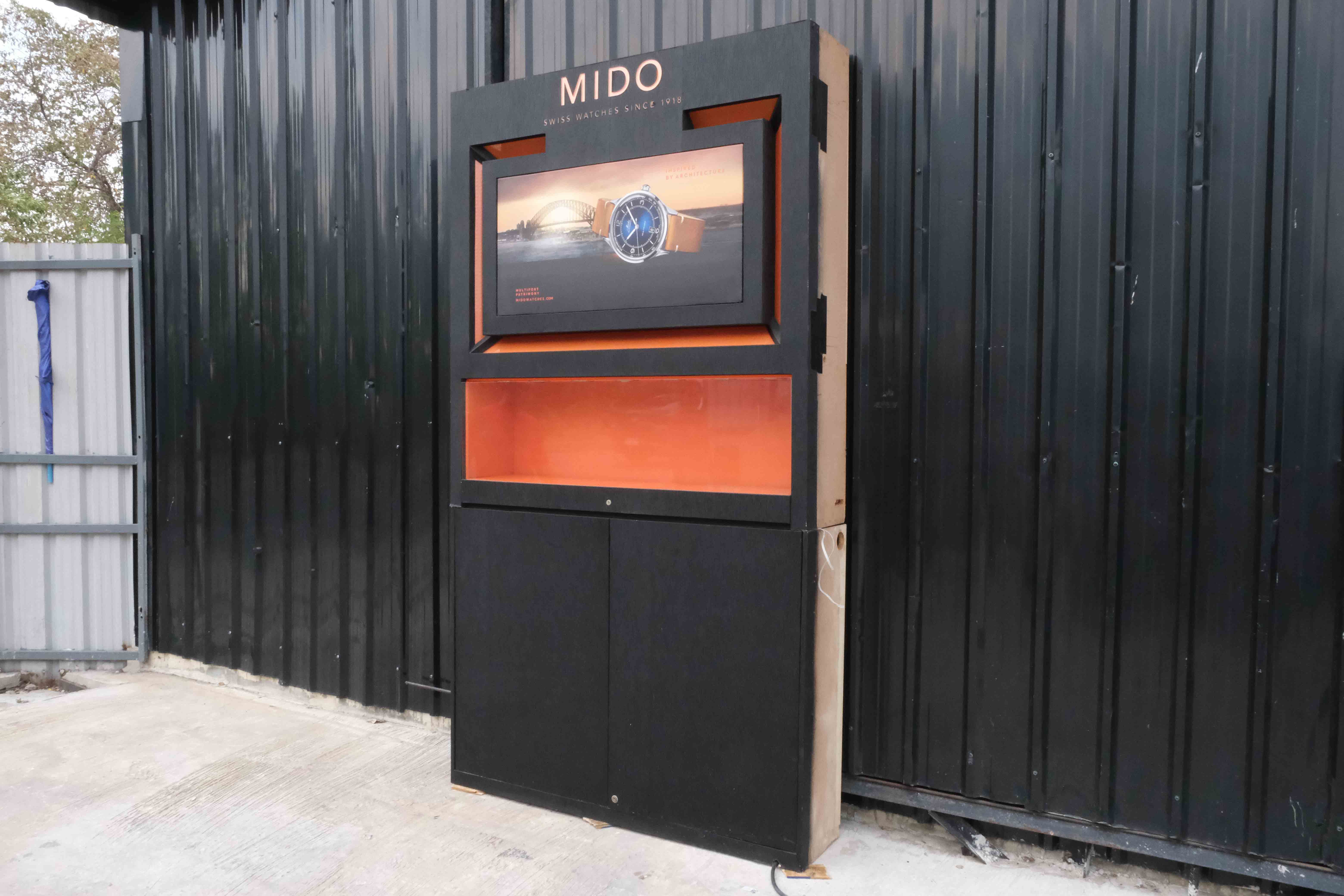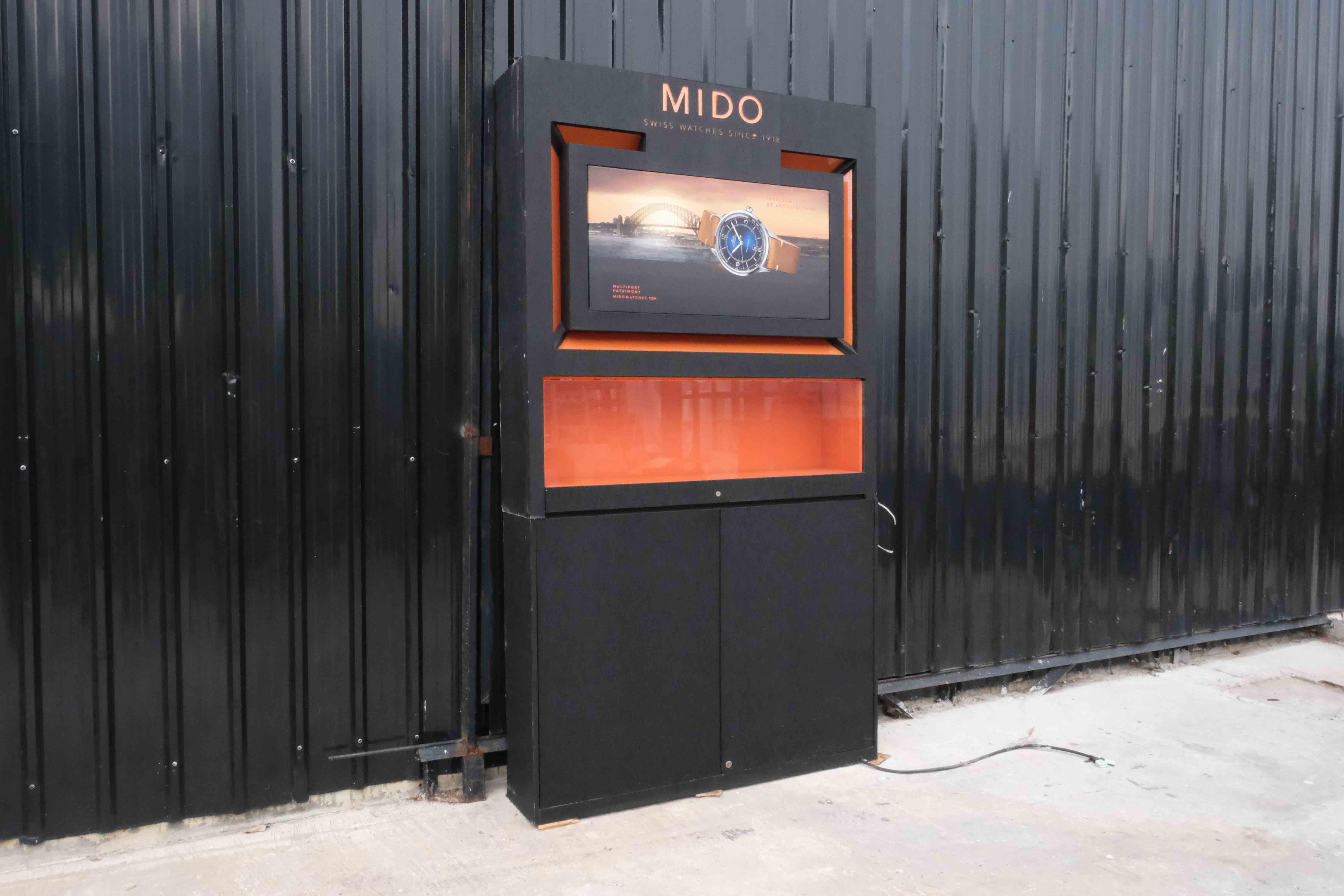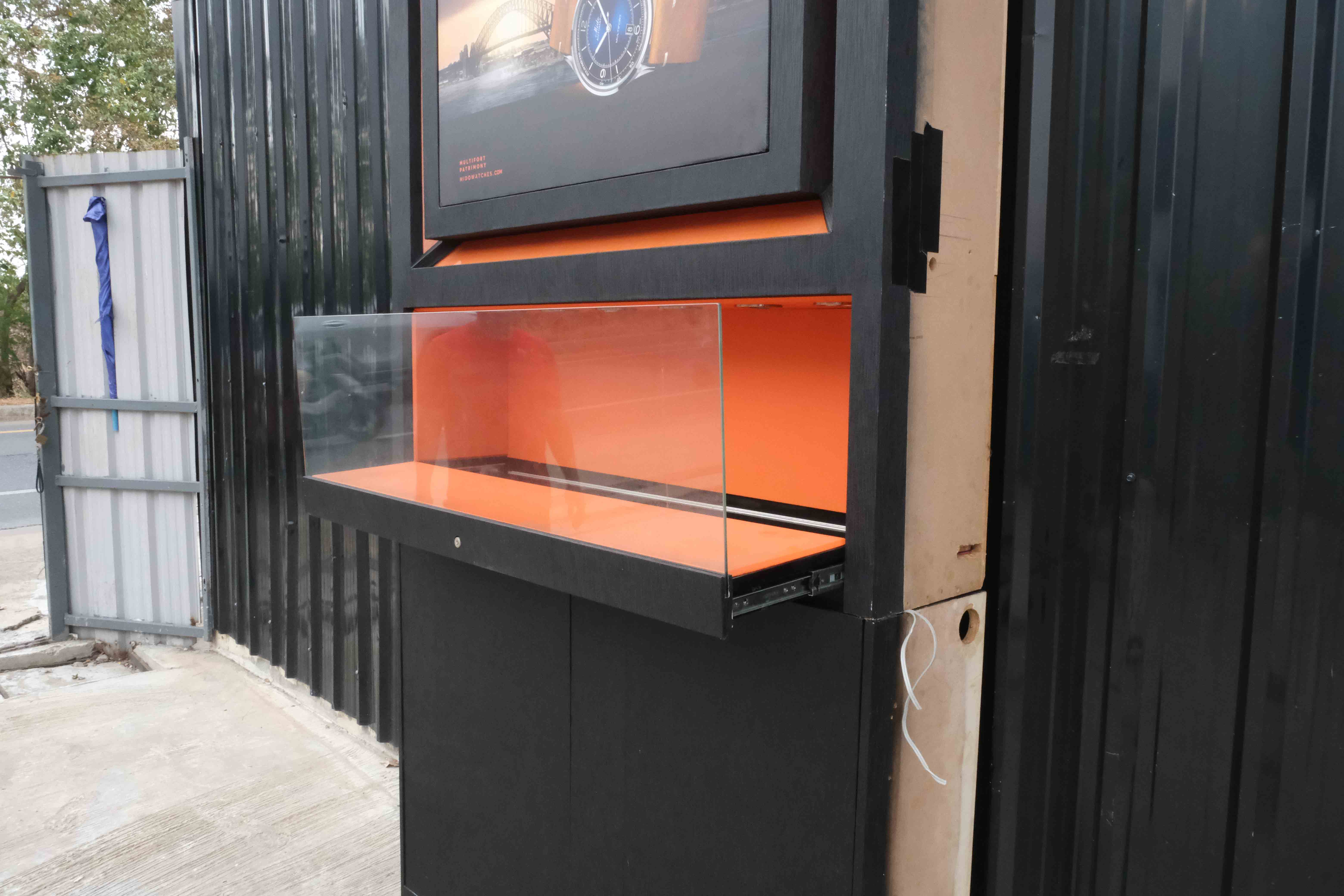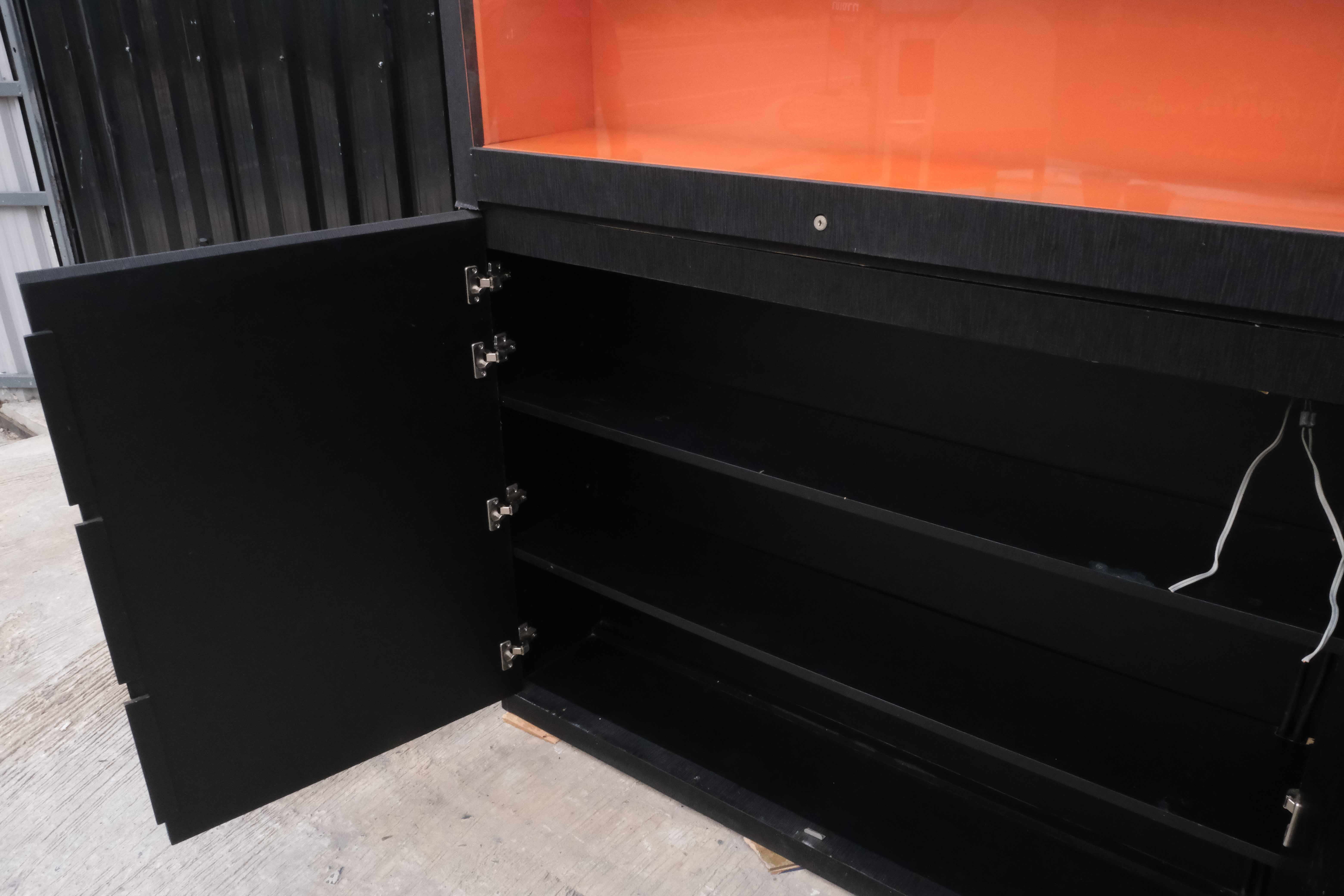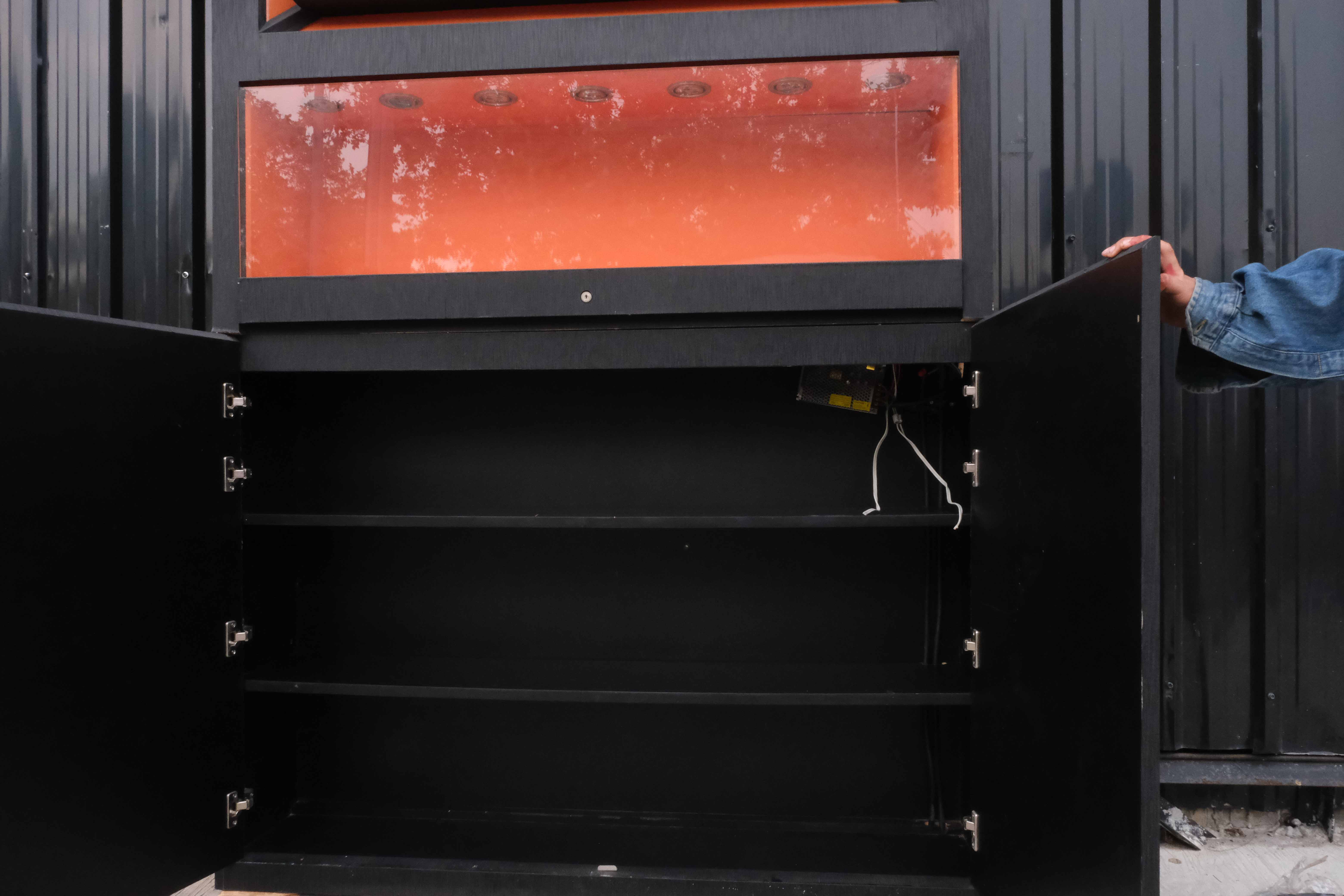 珠宝柜、玻璃柜展示产品方形,黑色木质底座,有2个可打开的储物柜。