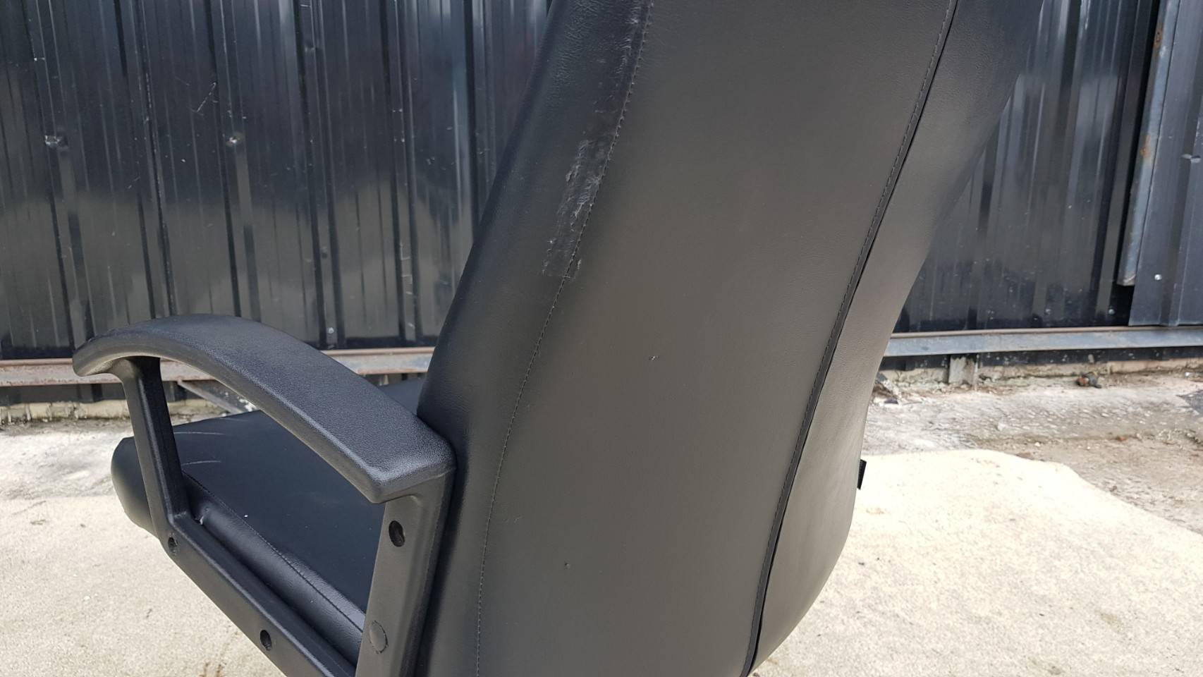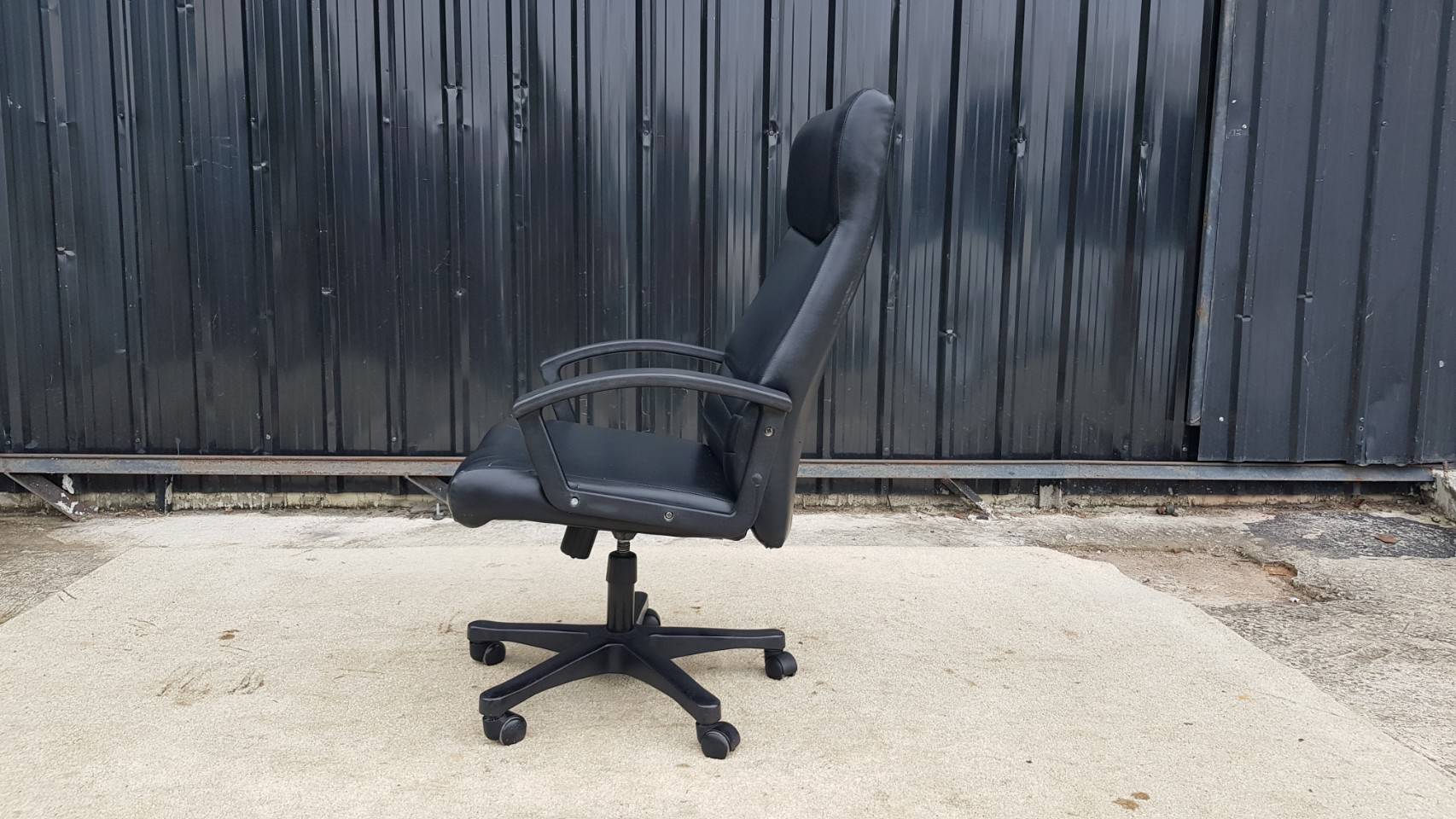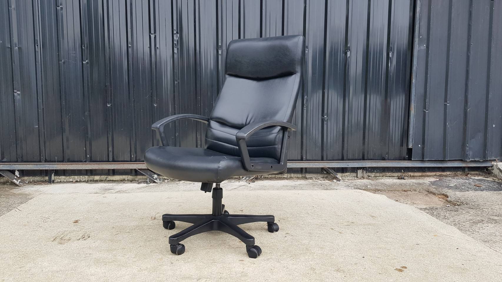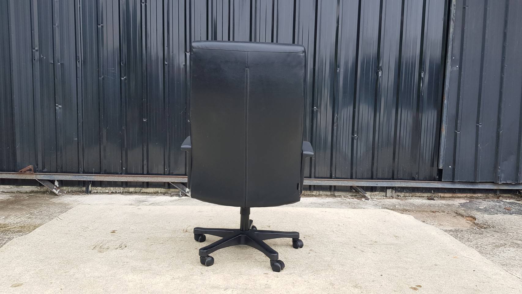 办公椅,黑色皮革内饰,高靠背,钢制框架,钢制扶手和腿,高度可调节。