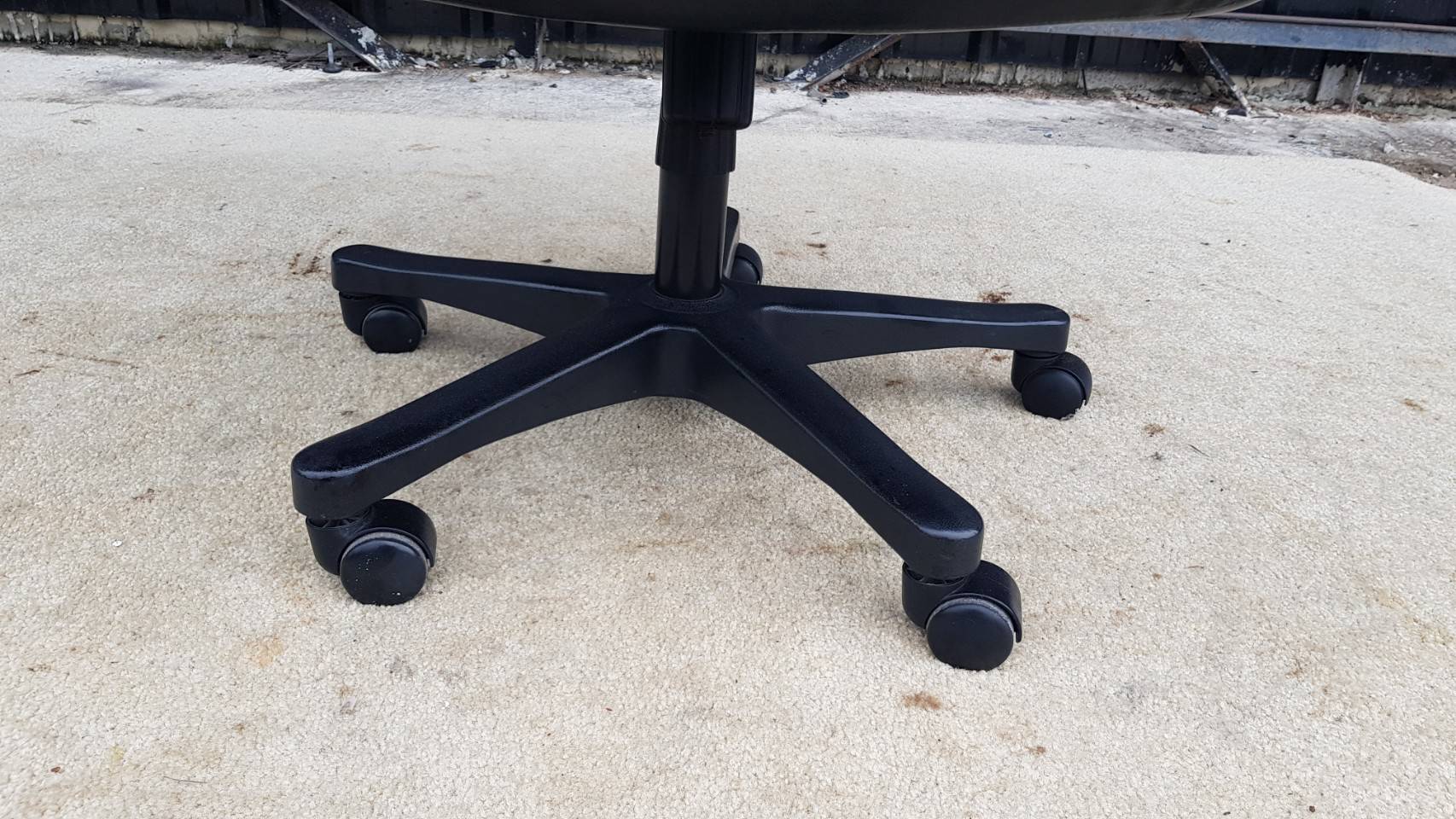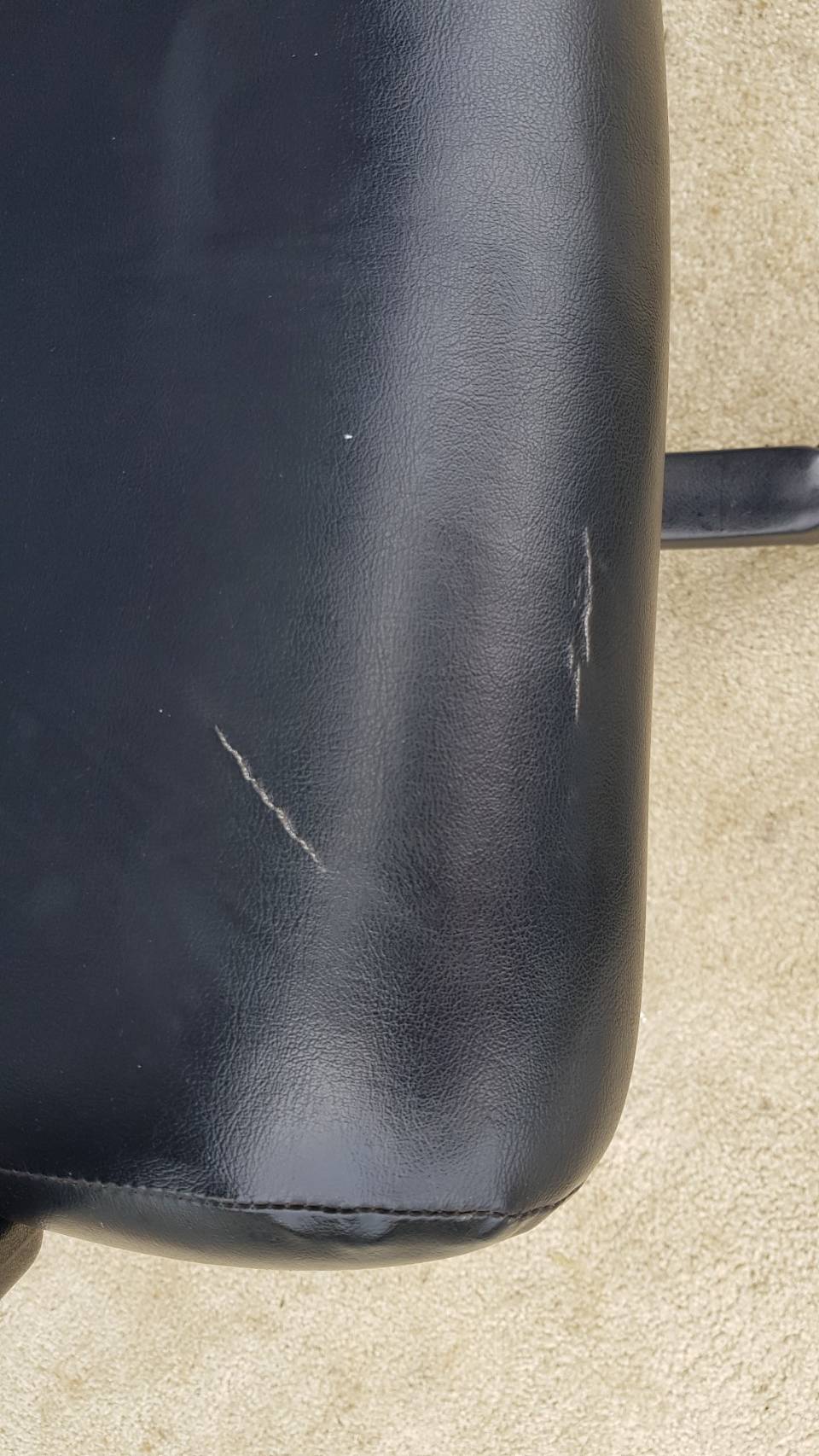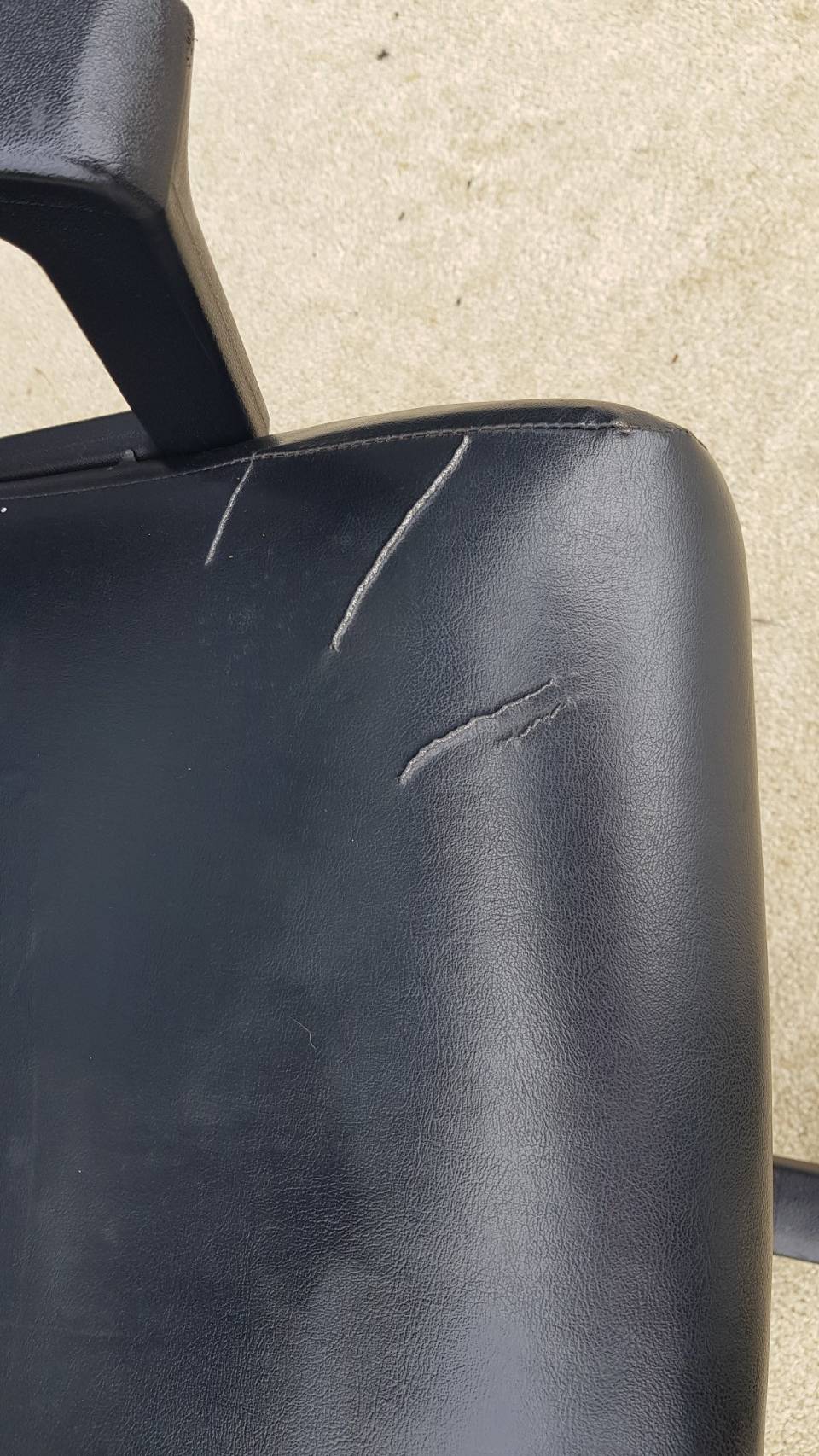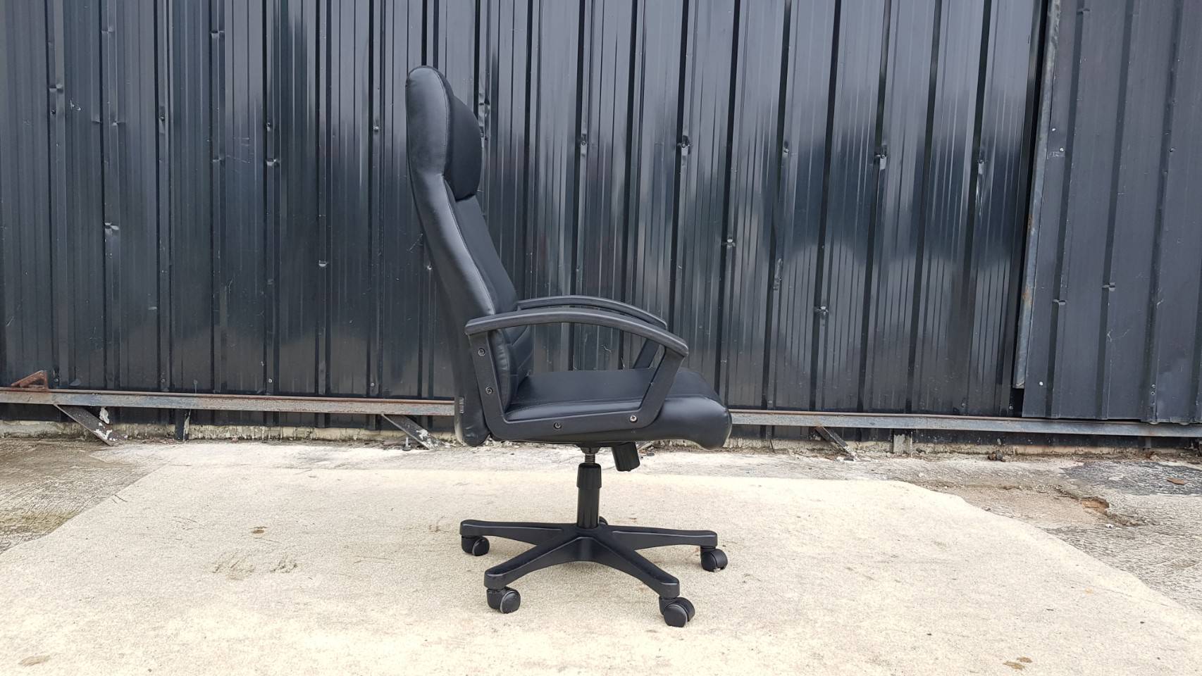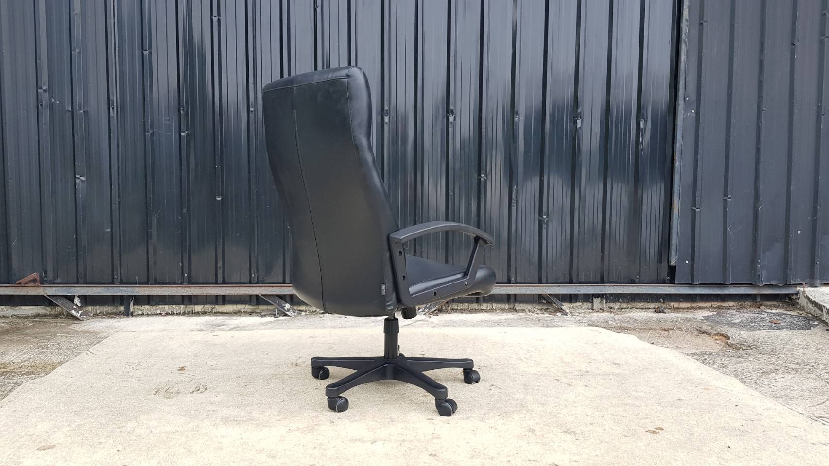 办公椅,黑色皮革内饰,高靠背,钢制框架,钢制扶手和腿,高度可调节。