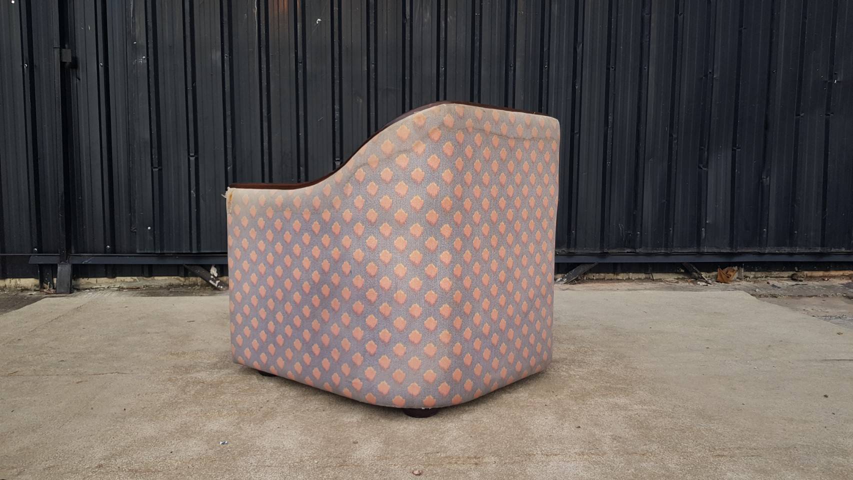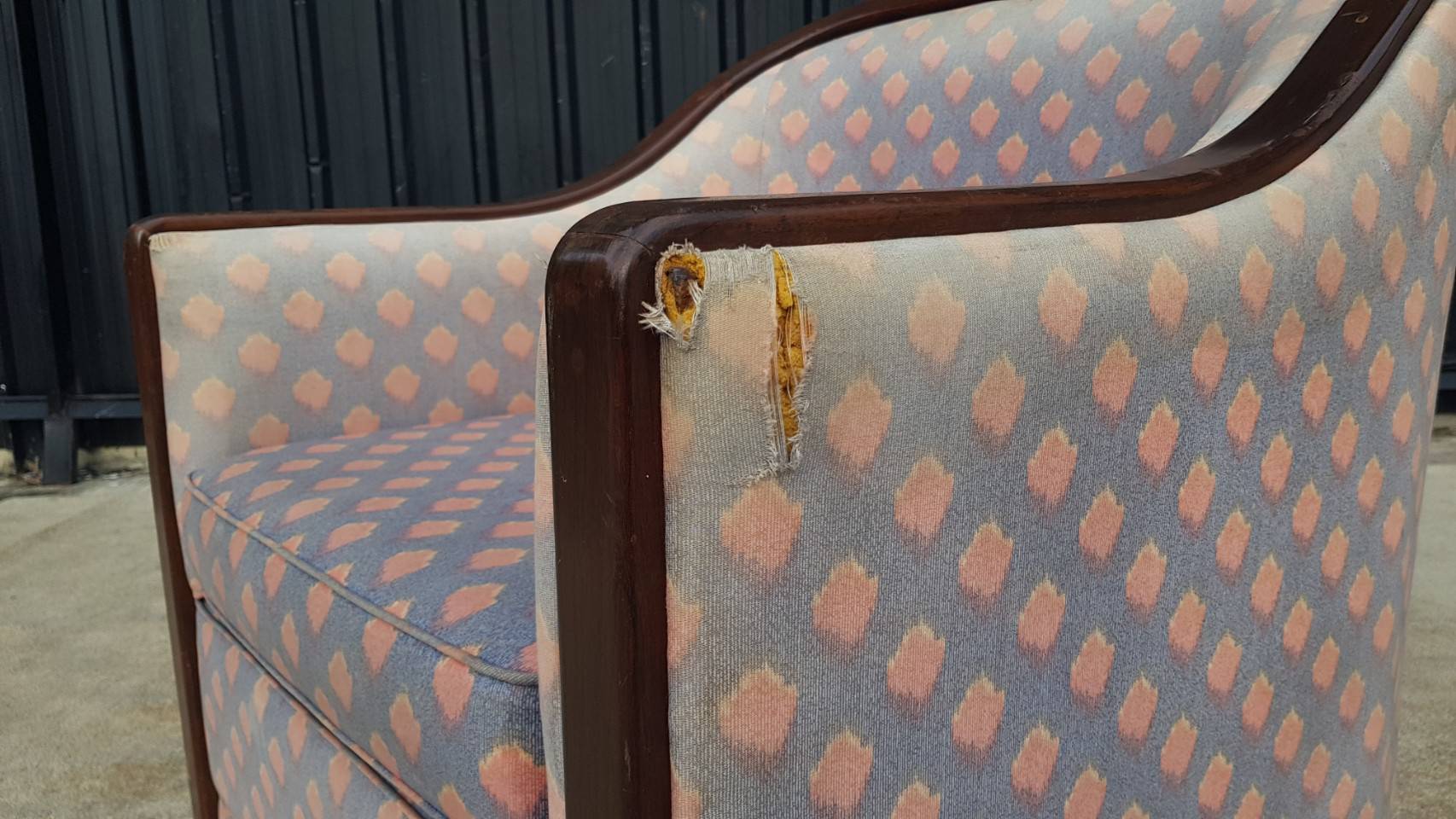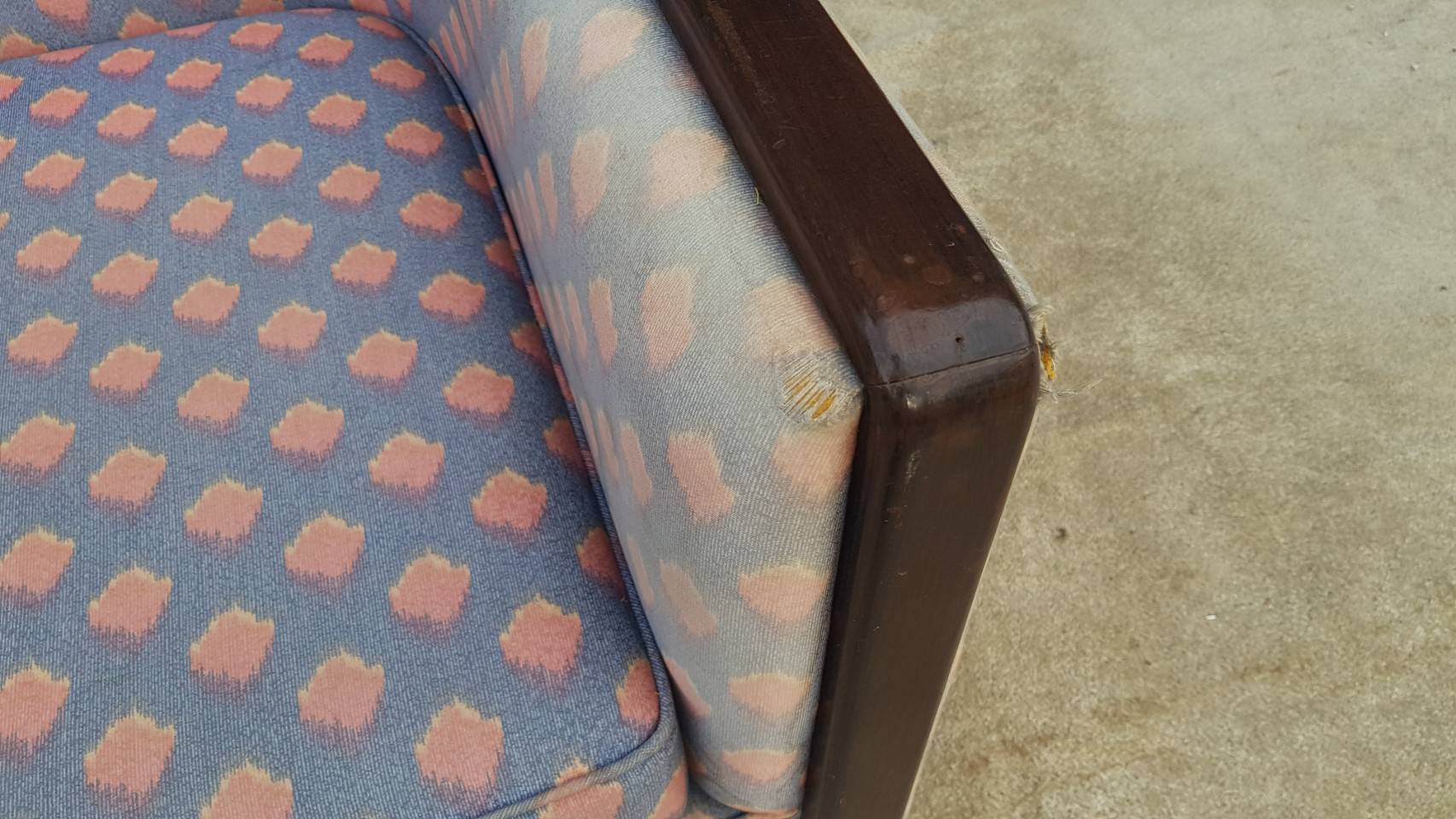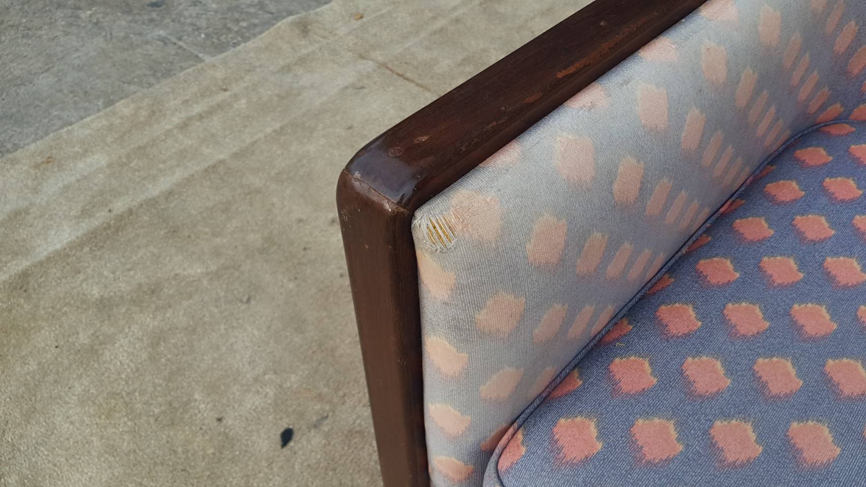 L-shaped sofa, 3-seater sofa, thick cream-pink fabric seats, wooden frame.