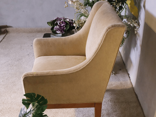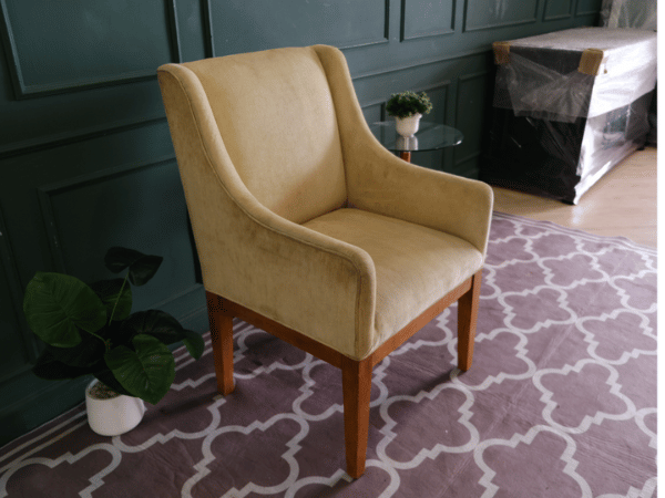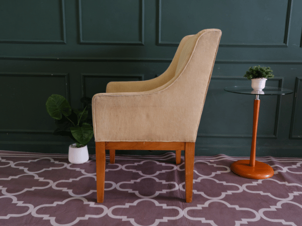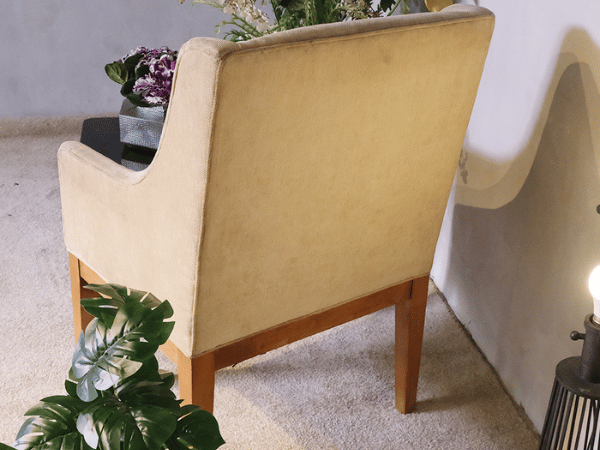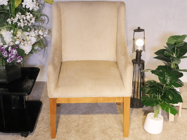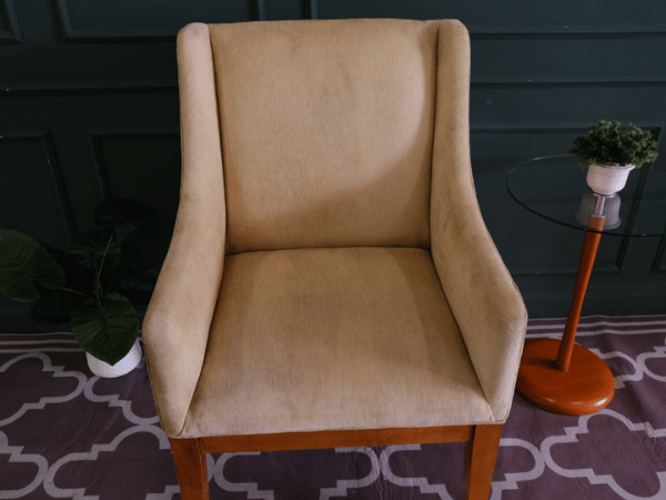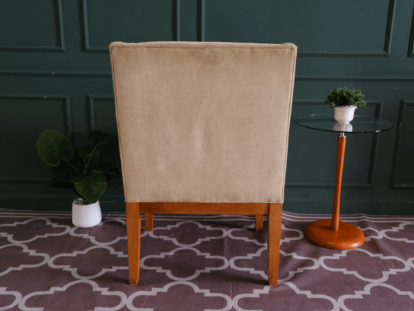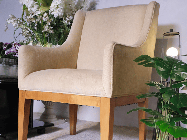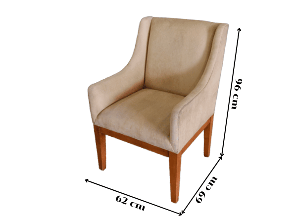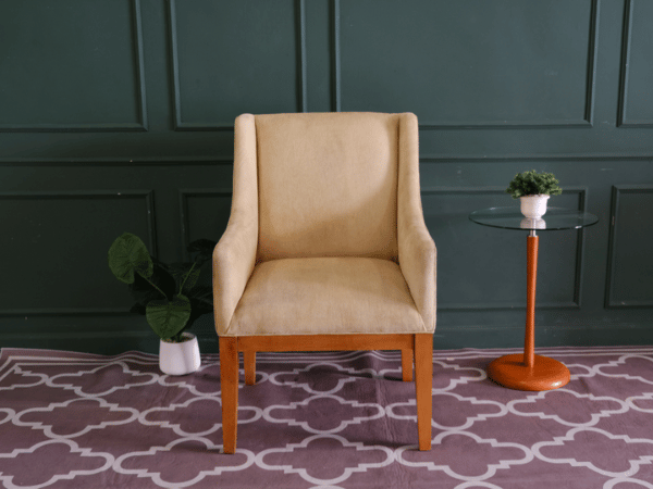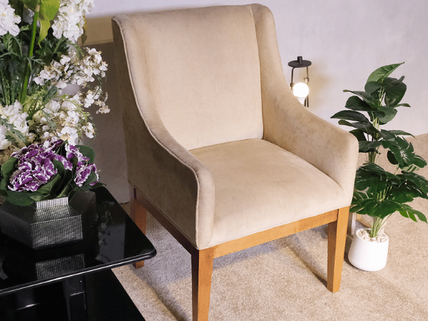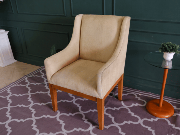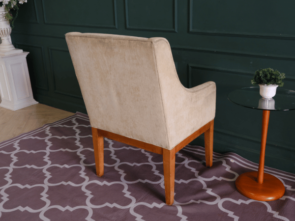 Armchair, wooden frame, fabric cushion, arm covers, cream color, embassy grade work.