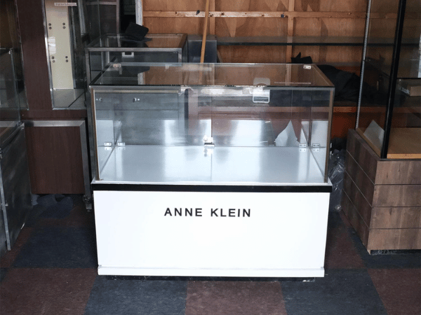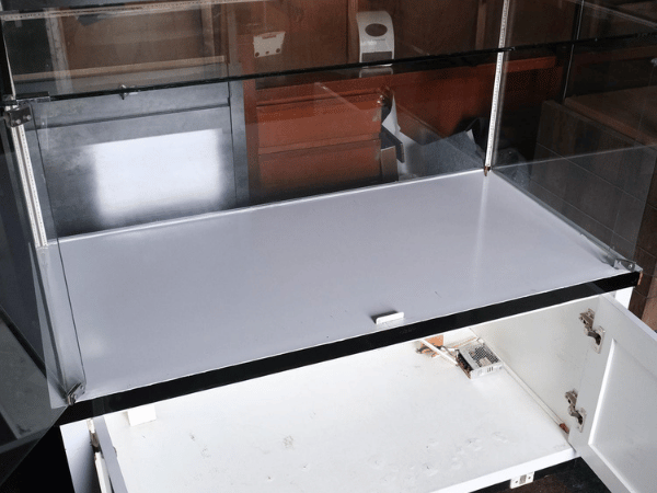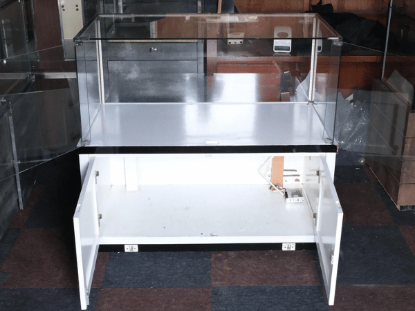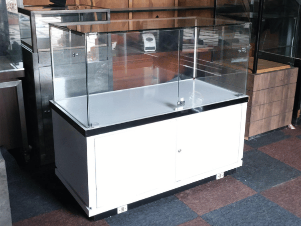 Jewelry cabinet, glass cabinet to display products Rectangular shape Drawer style glass door White wooden base with black trim