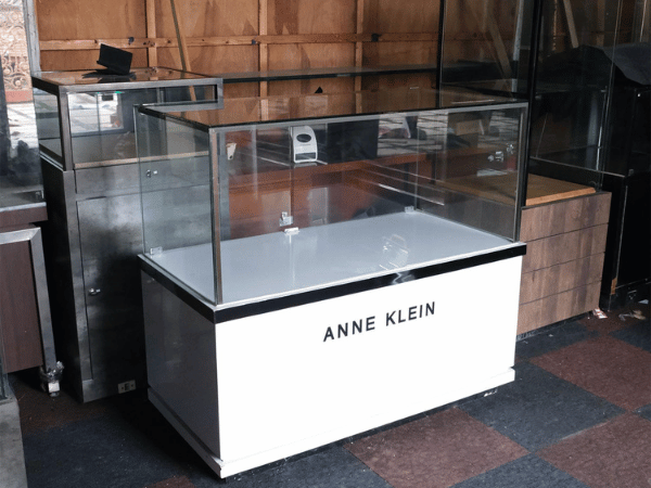 Jewelry cabinet, glass cabinet to display products Rectangular shape glass door open Brown wood pattern base