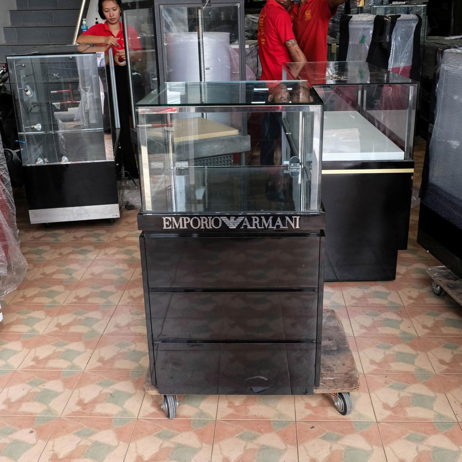 Jewelry cabinet, glass cabinet to display products square shape glass door open Brown wood pattern base