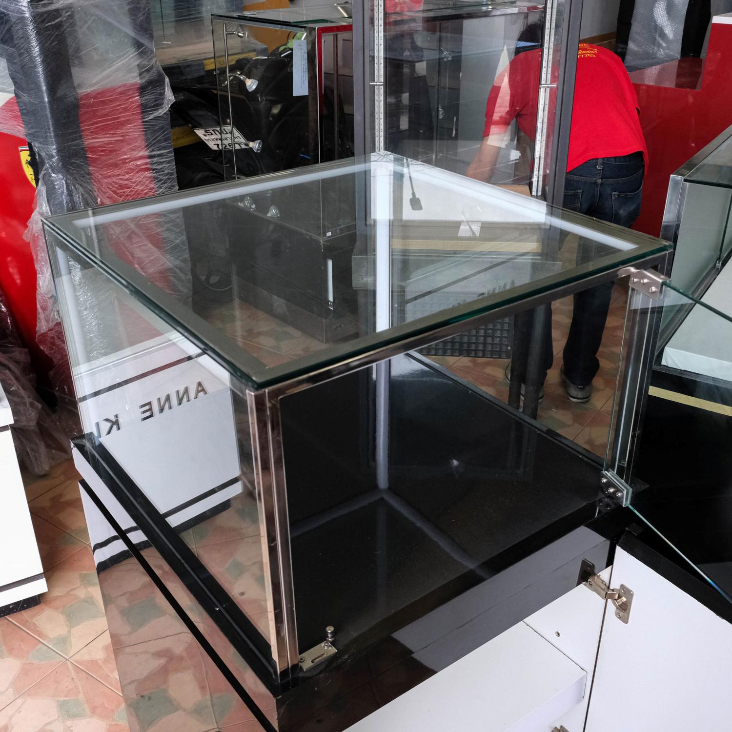 Jewelry cabinet, glass cabinet to display products Rectangular shape glass door open White wooden base with black trim