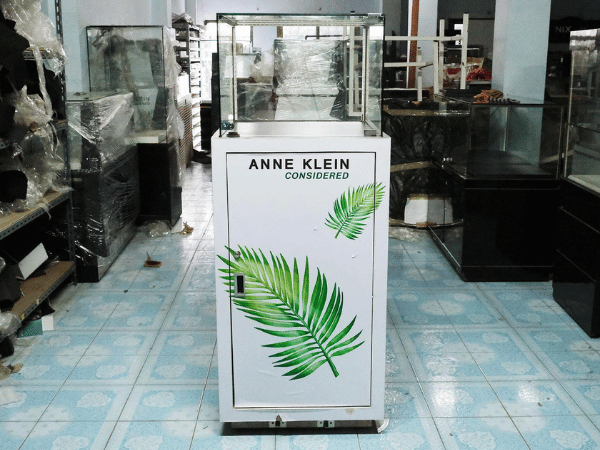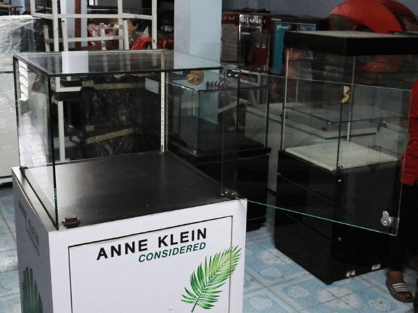 Jewelry cabinet, glass cabinet to display products Tall, square shape glass door open Black wooden base with silver trim