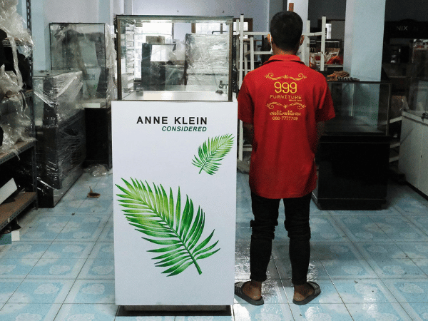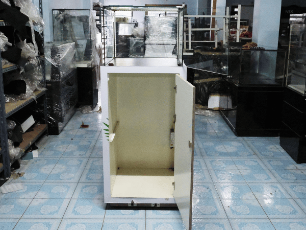 Jewelry cabinet, glass cabinet to display products Tall, square shape glass door open Gray stone pattern wood base