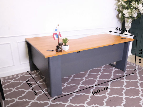 L-shaped corner work desk, brown wood top, gray steel legs.