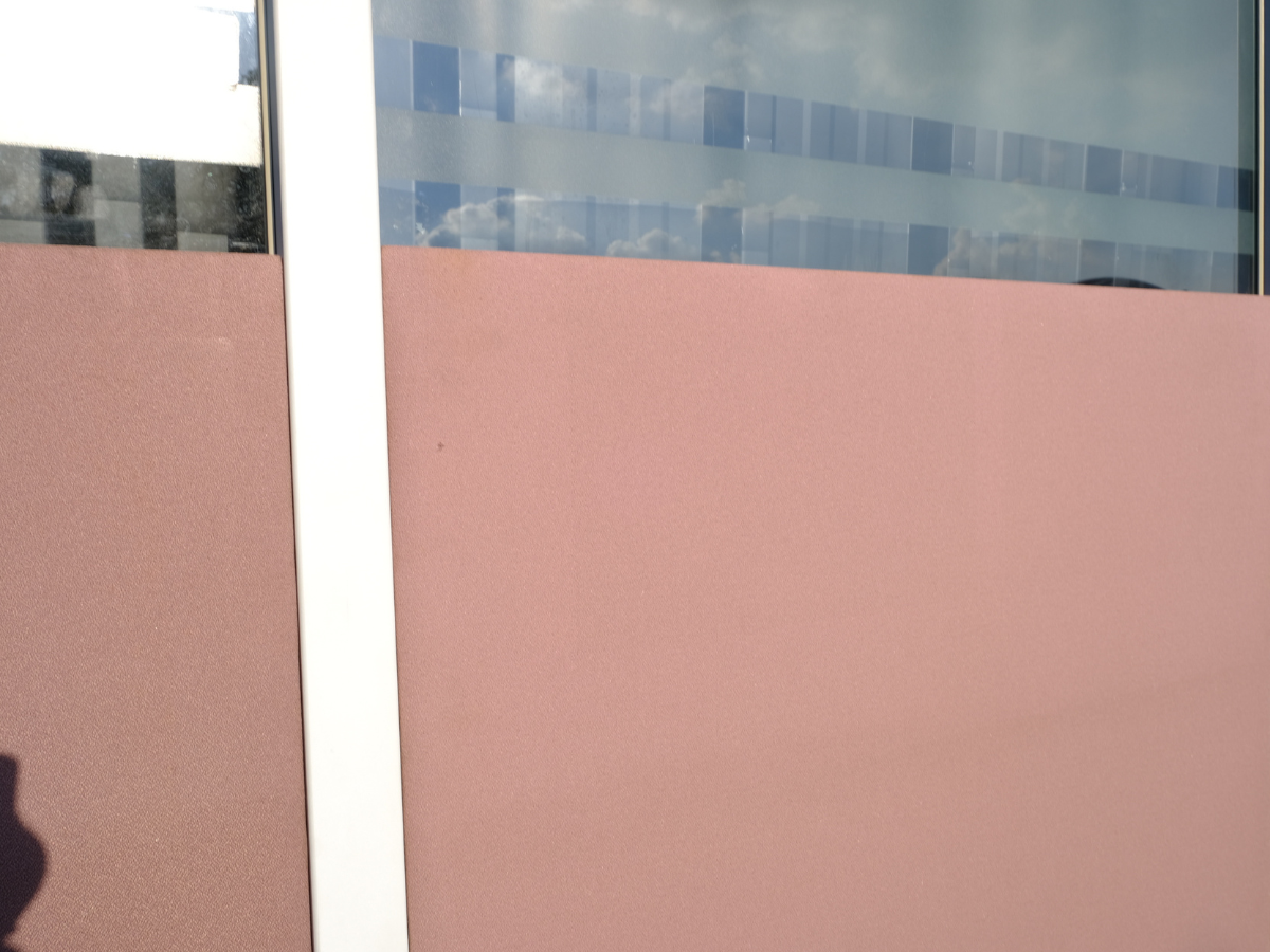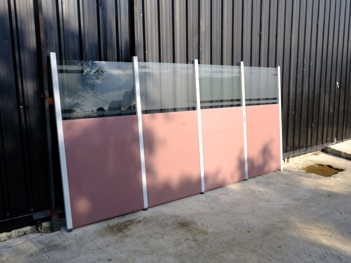 Partition, steel frame, glass top, brown color.