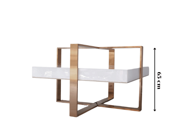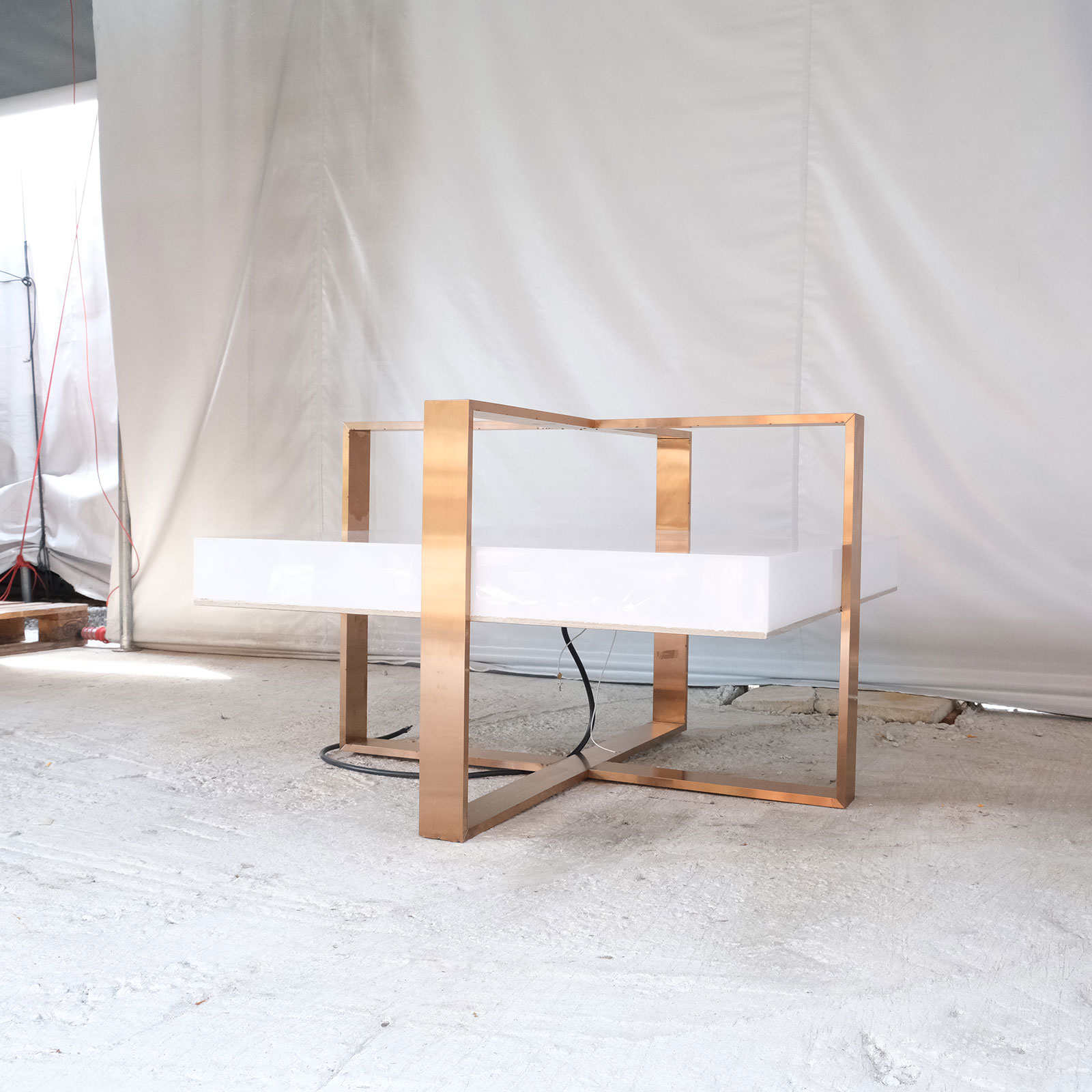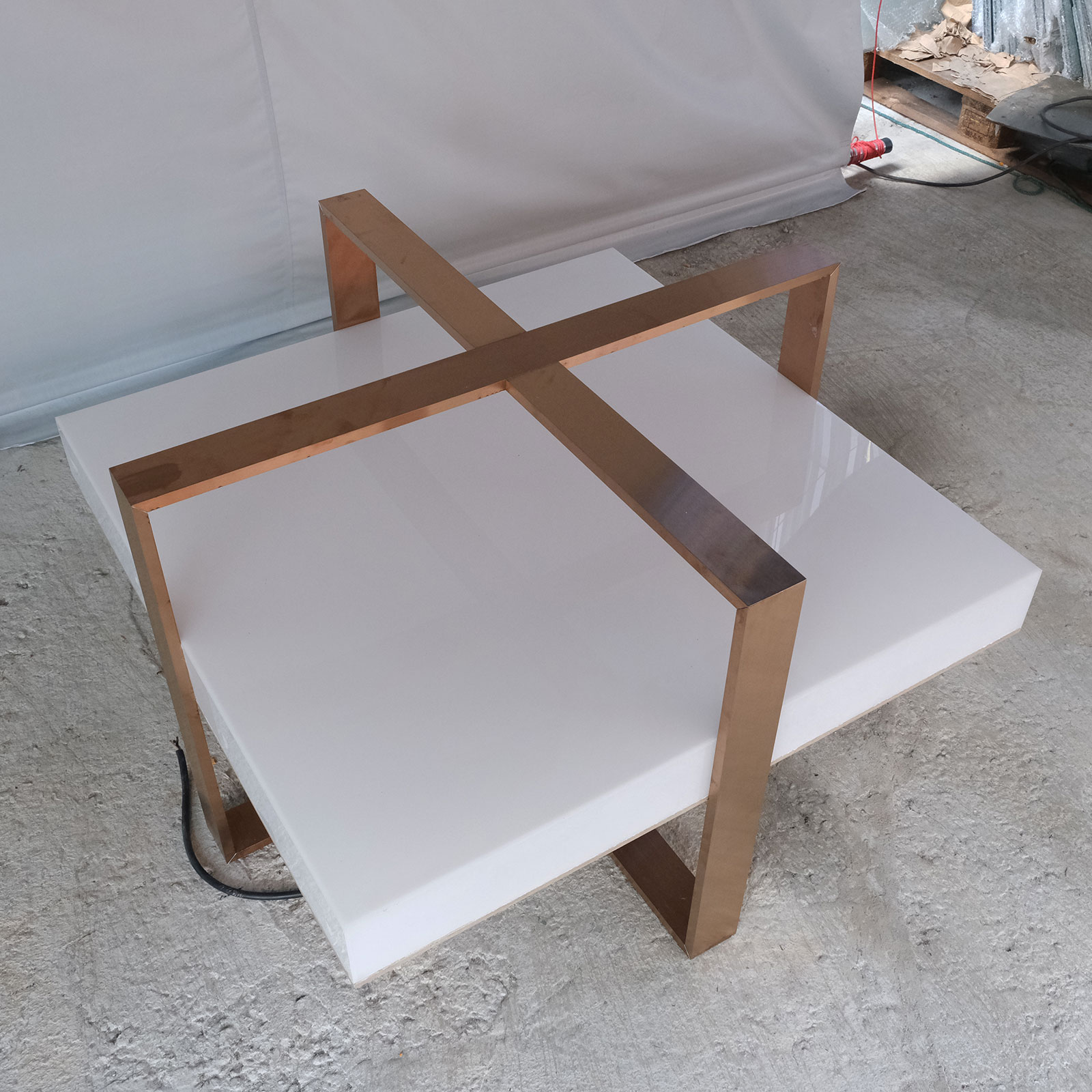 Hexagonal product shelf, steel frame, blue acrylic frame.