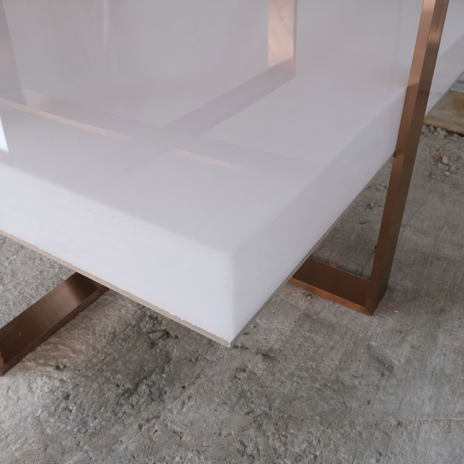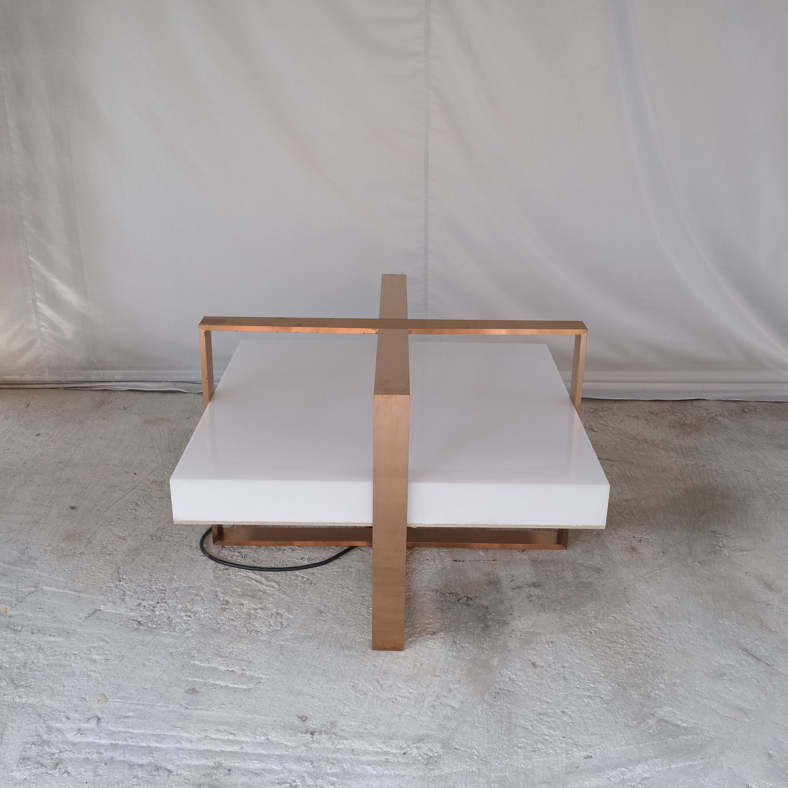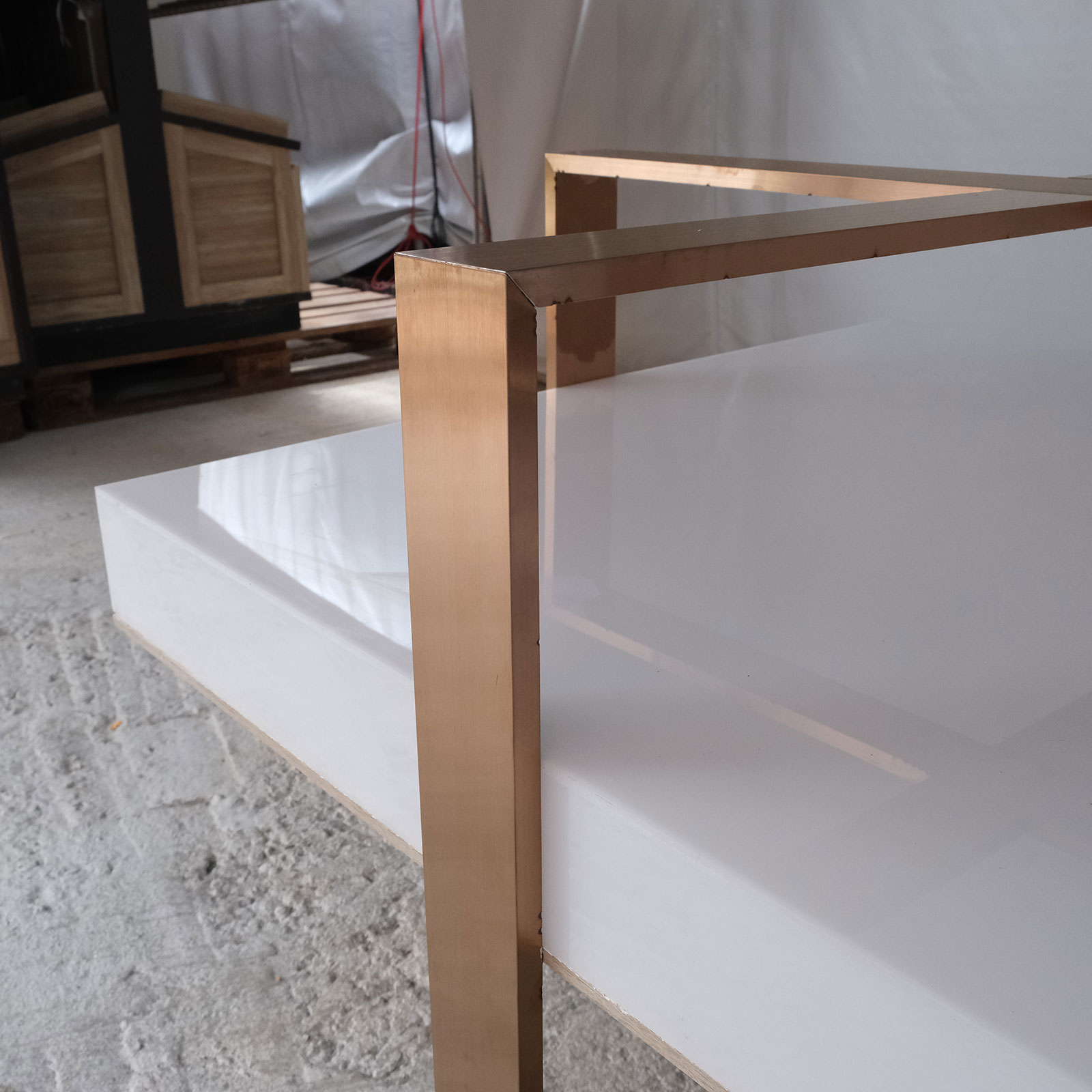 Hexagonal product shelf, steel frame, blue acrylic frame.