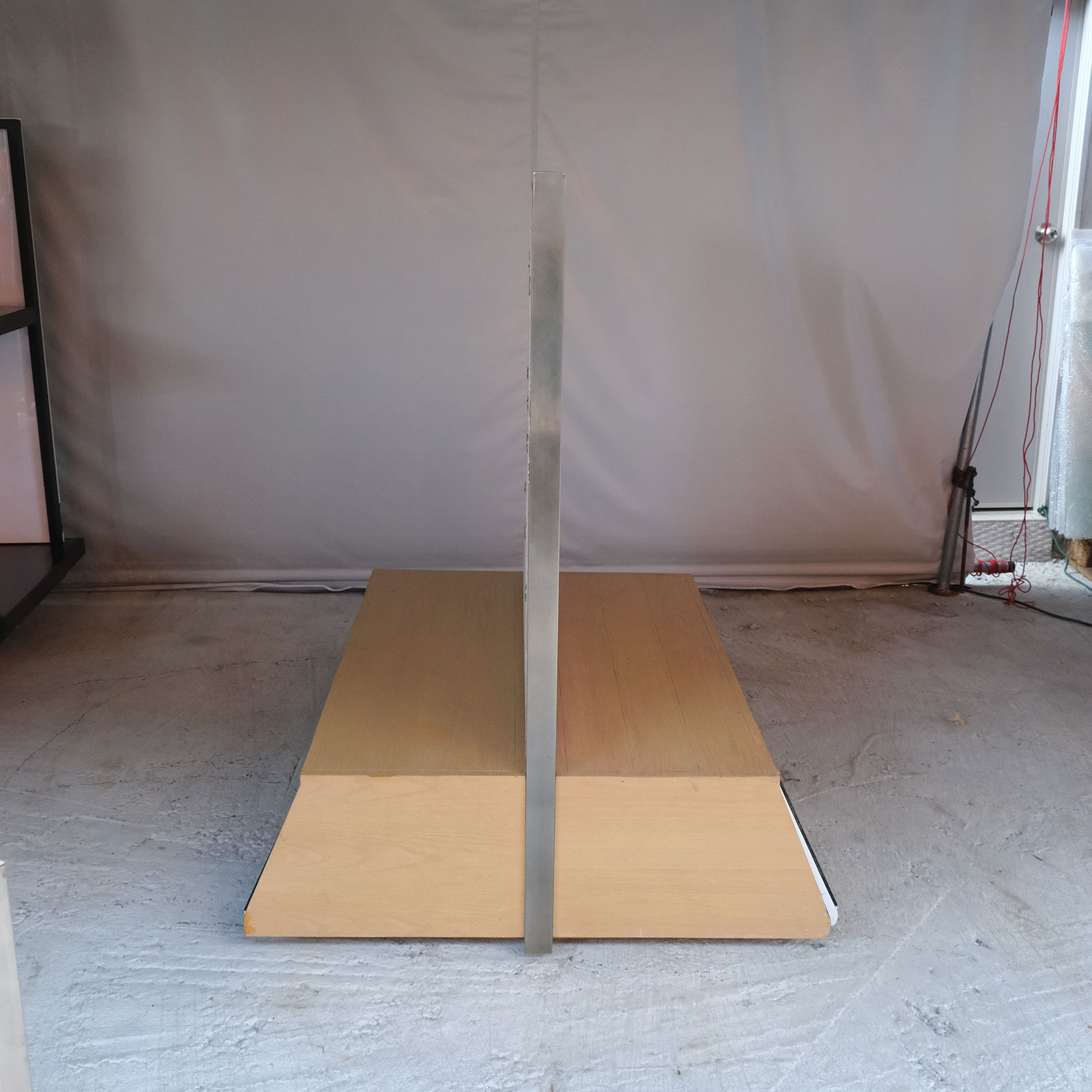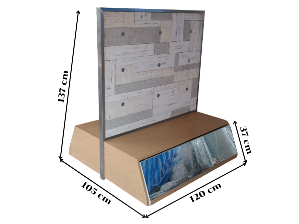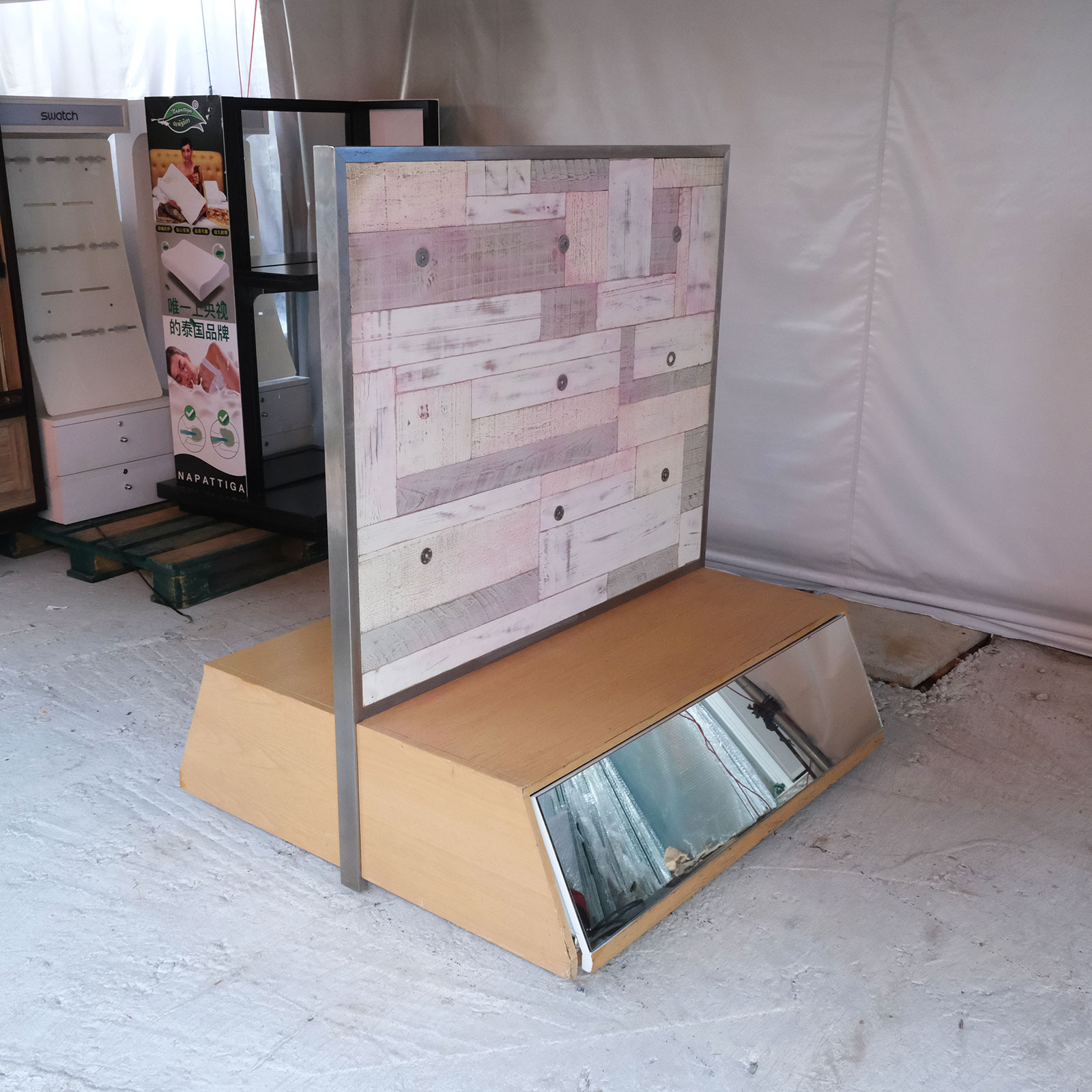 Product shelf, display stand, 1 side, wooden frame, brown wood pattern, has 1 compartment.