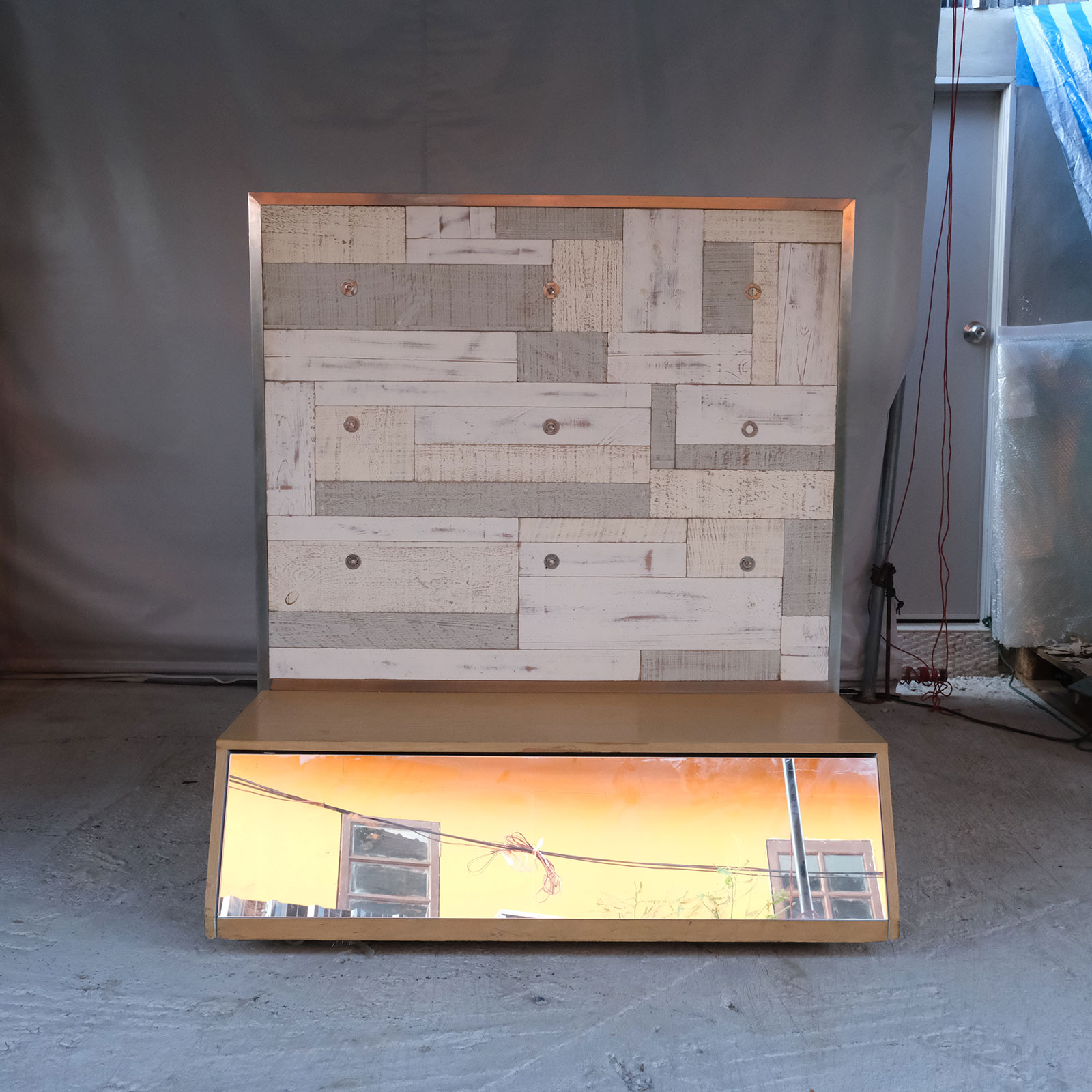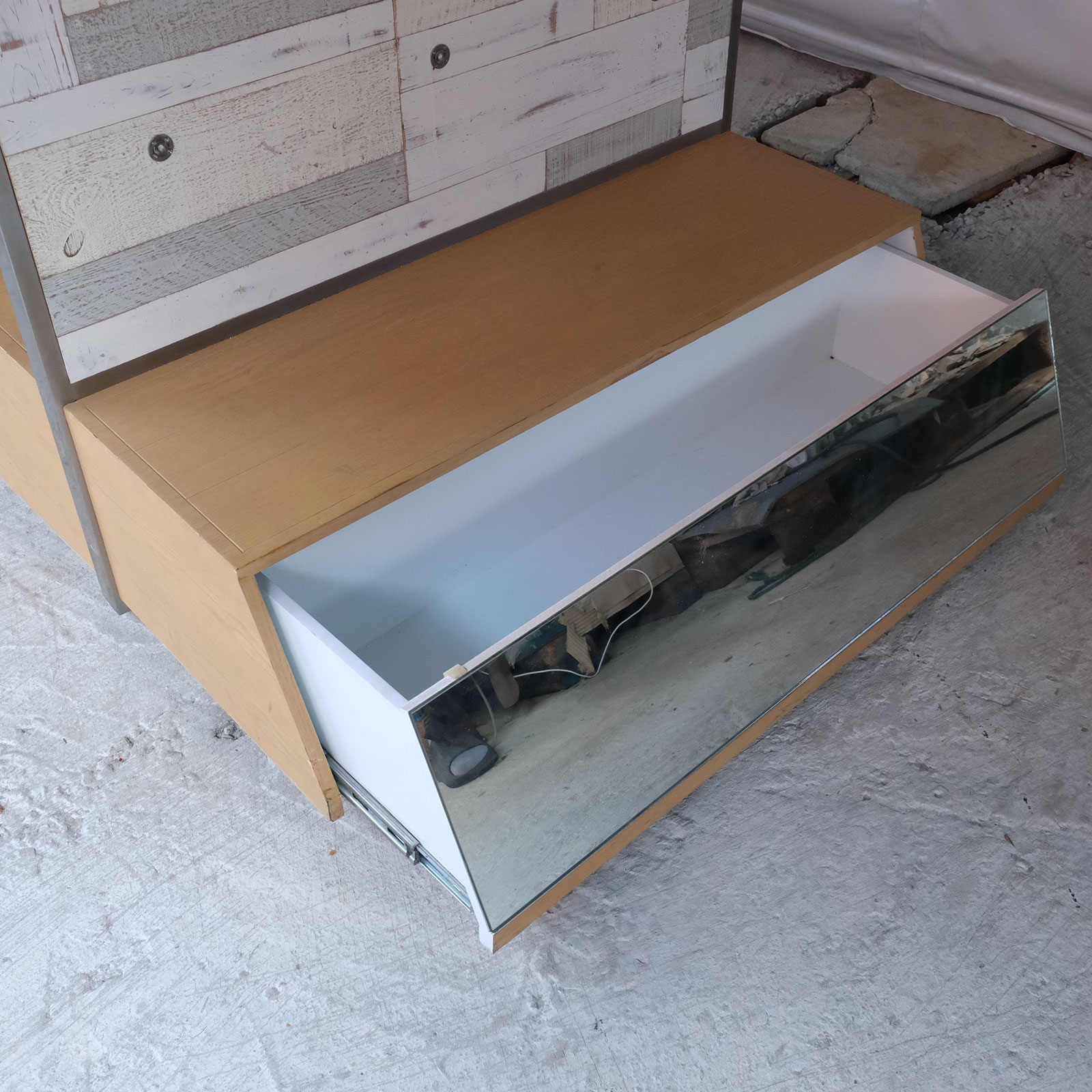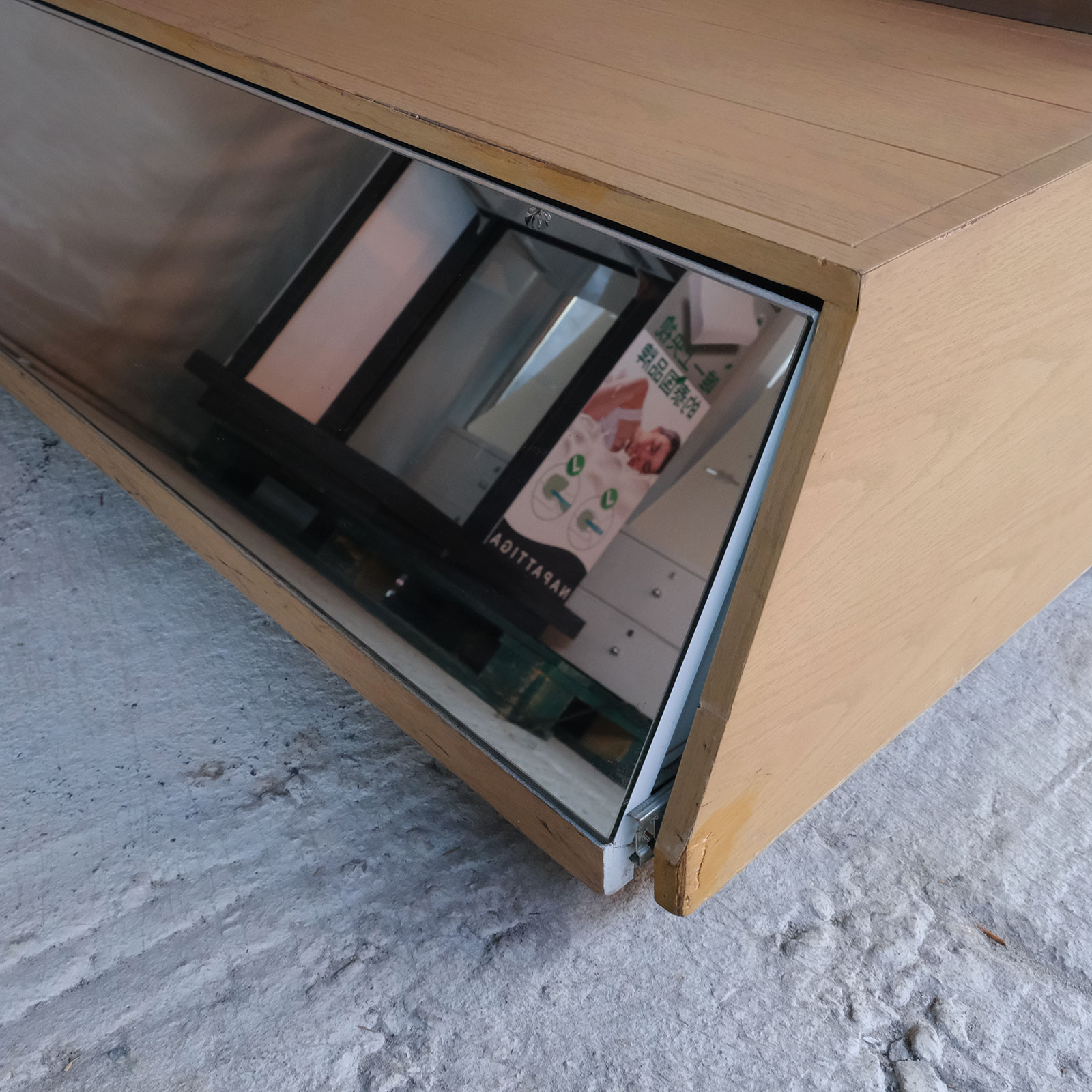 Product shelf, display stand, 1 side, wooden frame, brown wood pattern, has 1 compartment.