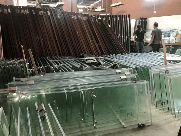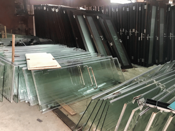 Tall, narrow wooden door with clear glass panels and lever-type knobs.