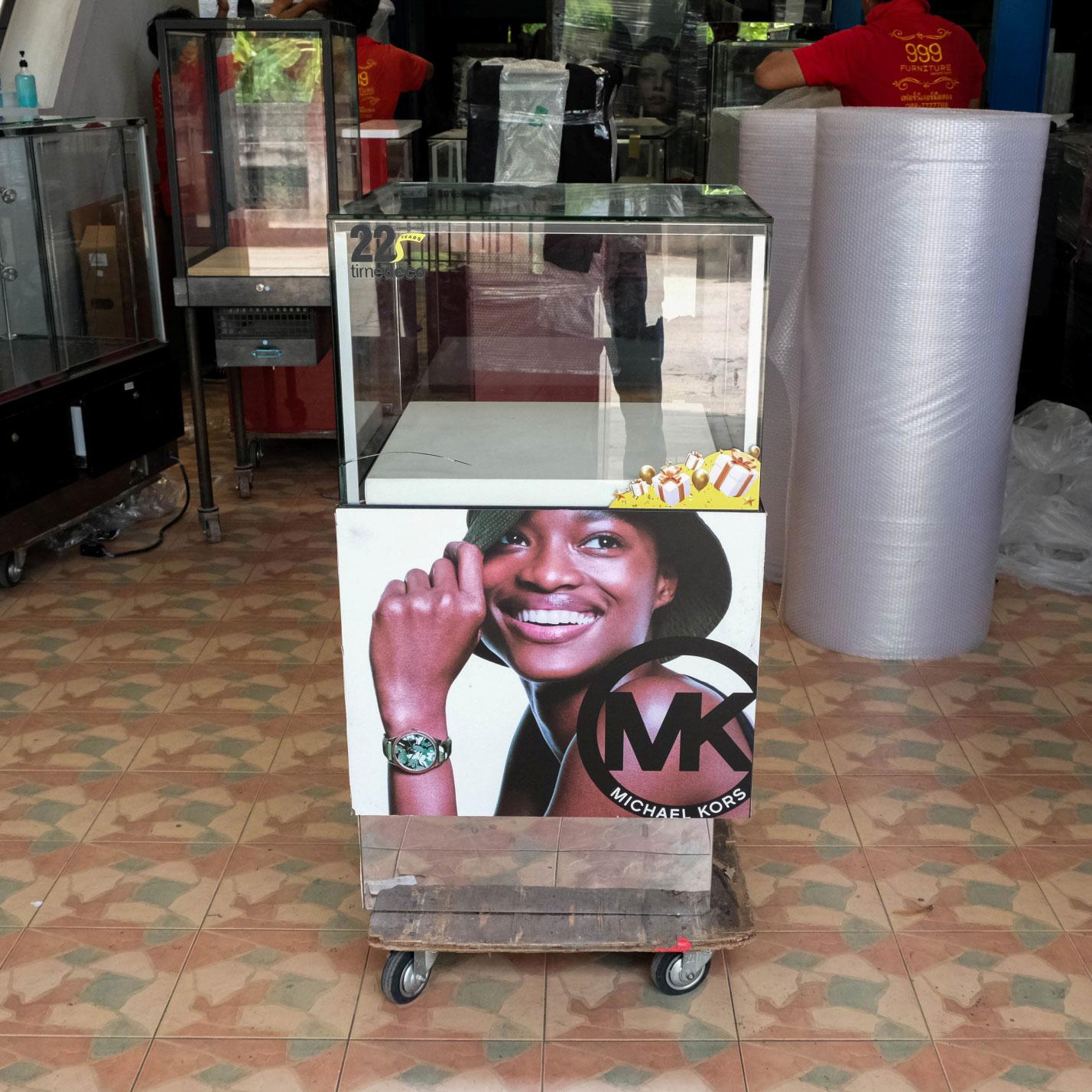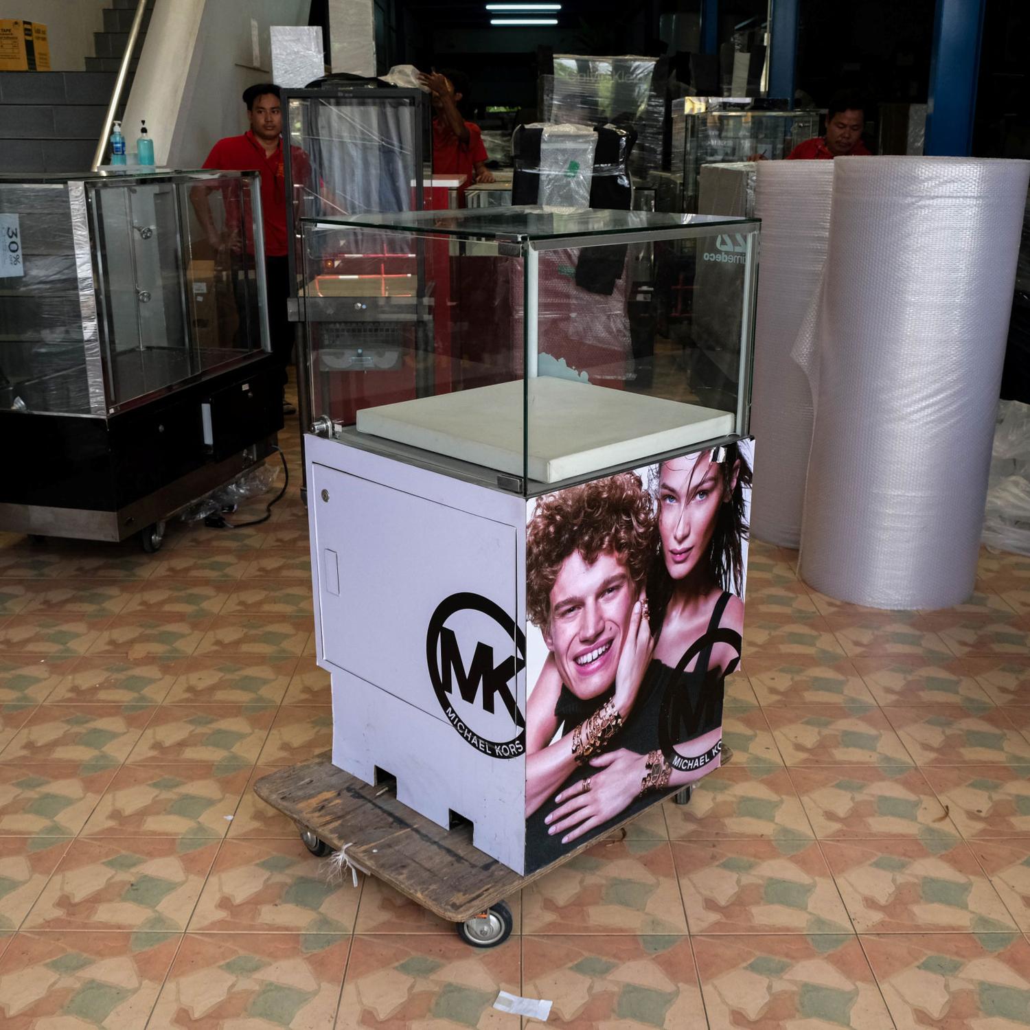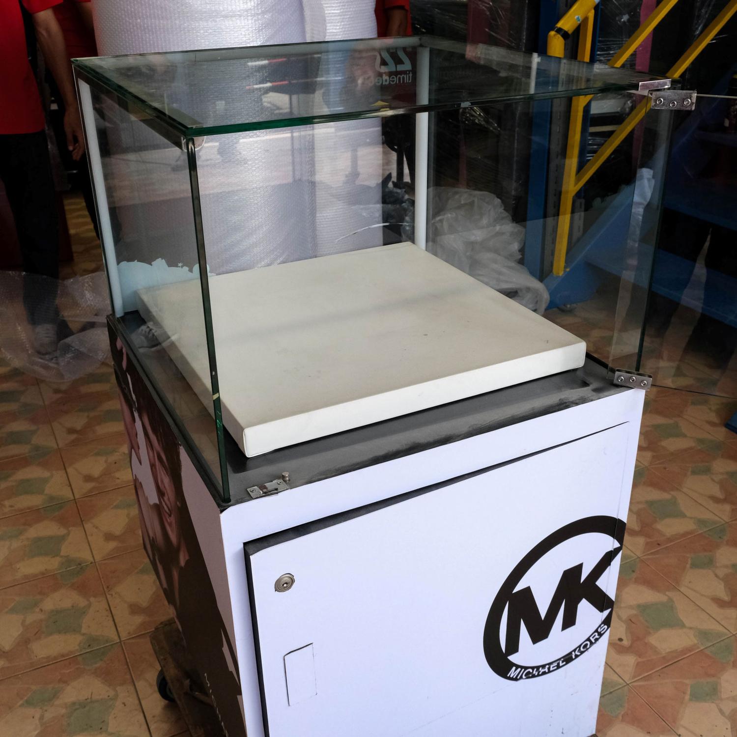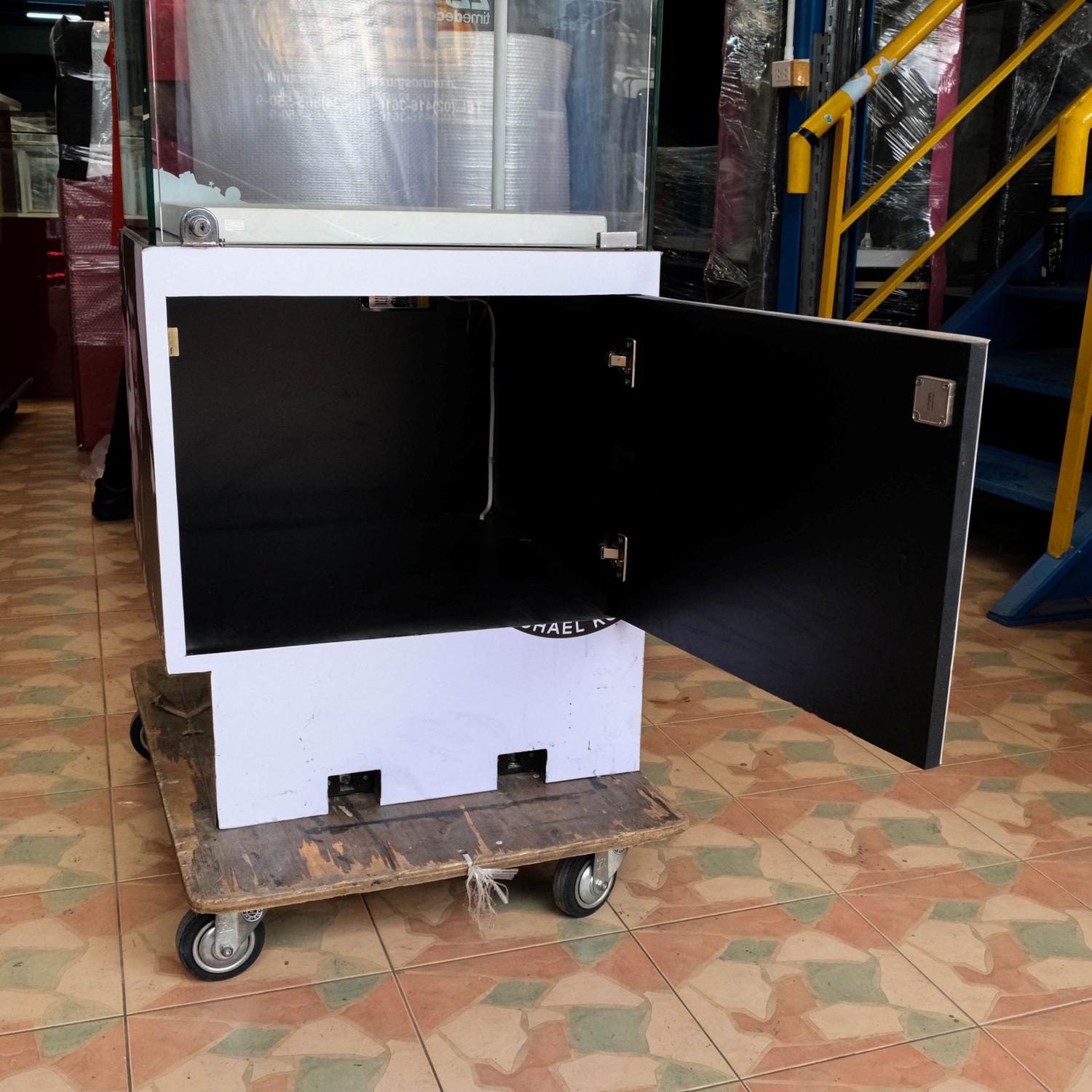 ตู้จิวเวลรี่ ตู้โชว์สินค้ากระจกทรงสี่เหลี่ยมคางหมู มีที่เก็บของด้านล่าง มีล้อ (มี 6 ใบ) *ไม่มีกุญแจ