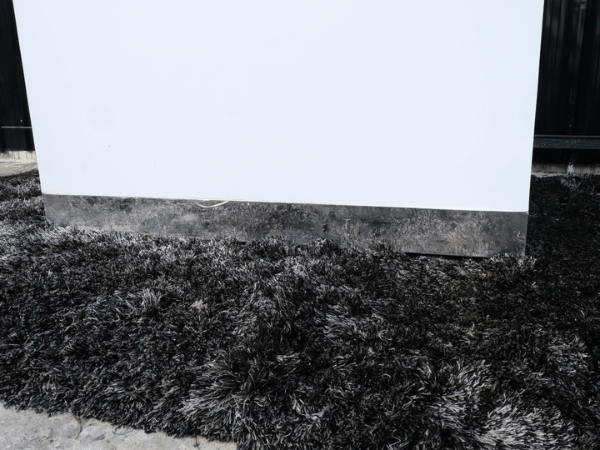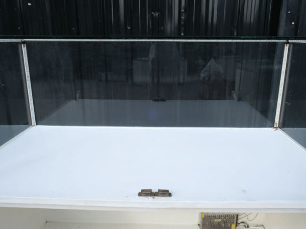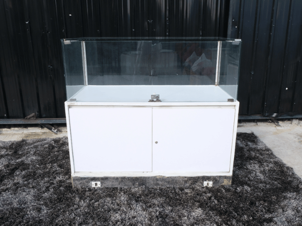 ตู้จิวเวลรี่ ตู้กระจกโชว์สินค้า ทรงสี่เหลี่ยมผืนผ้าประตูกระจกบานเปิด ฐานไม้สีขาวคาดเงิน(มีล้อ / ไม่มีกุญแจ)
