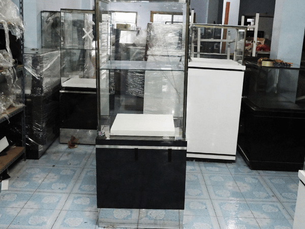 ตู้จิวเวลรี่ ตู้กระจกโชว์สินค้า ทรงสี่เหลี่ยมผืนผ้า ประตูกระจกบานเปิด ฐานไม้สีขาวคาดดำ (มี 1 ใบ)