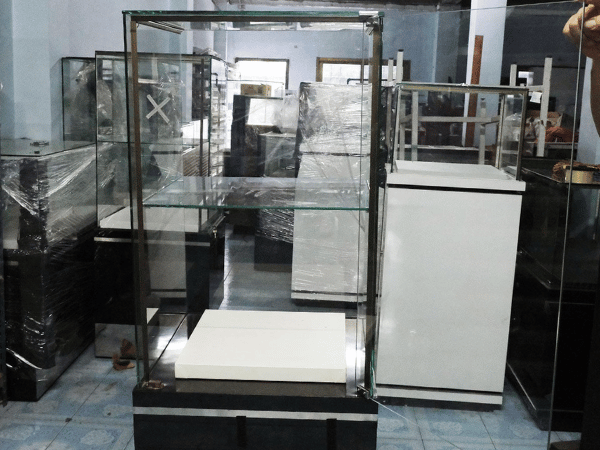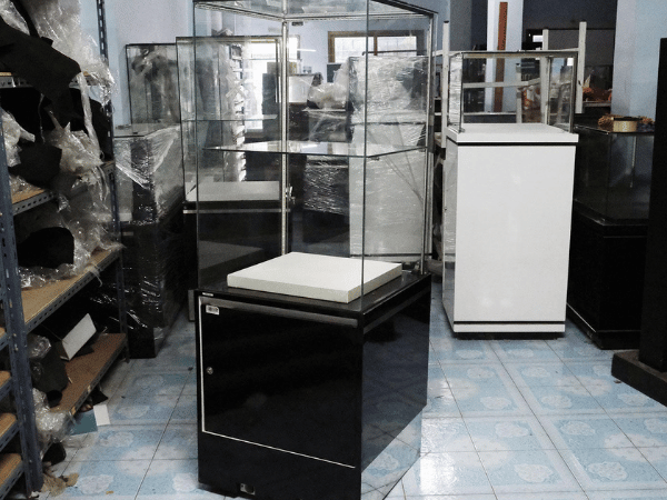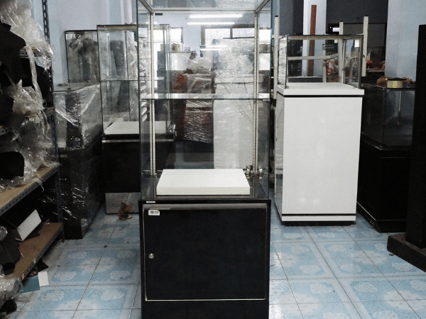 ตู้จิวเวลรี่ ตู้โชว์สินค้ากระจกทรงสี่เหลี่ยมคางหมู มีที่เก็บของด้านล่าง มีล้อ (มี 6 ใบ) *ไม่มีกุญแจ