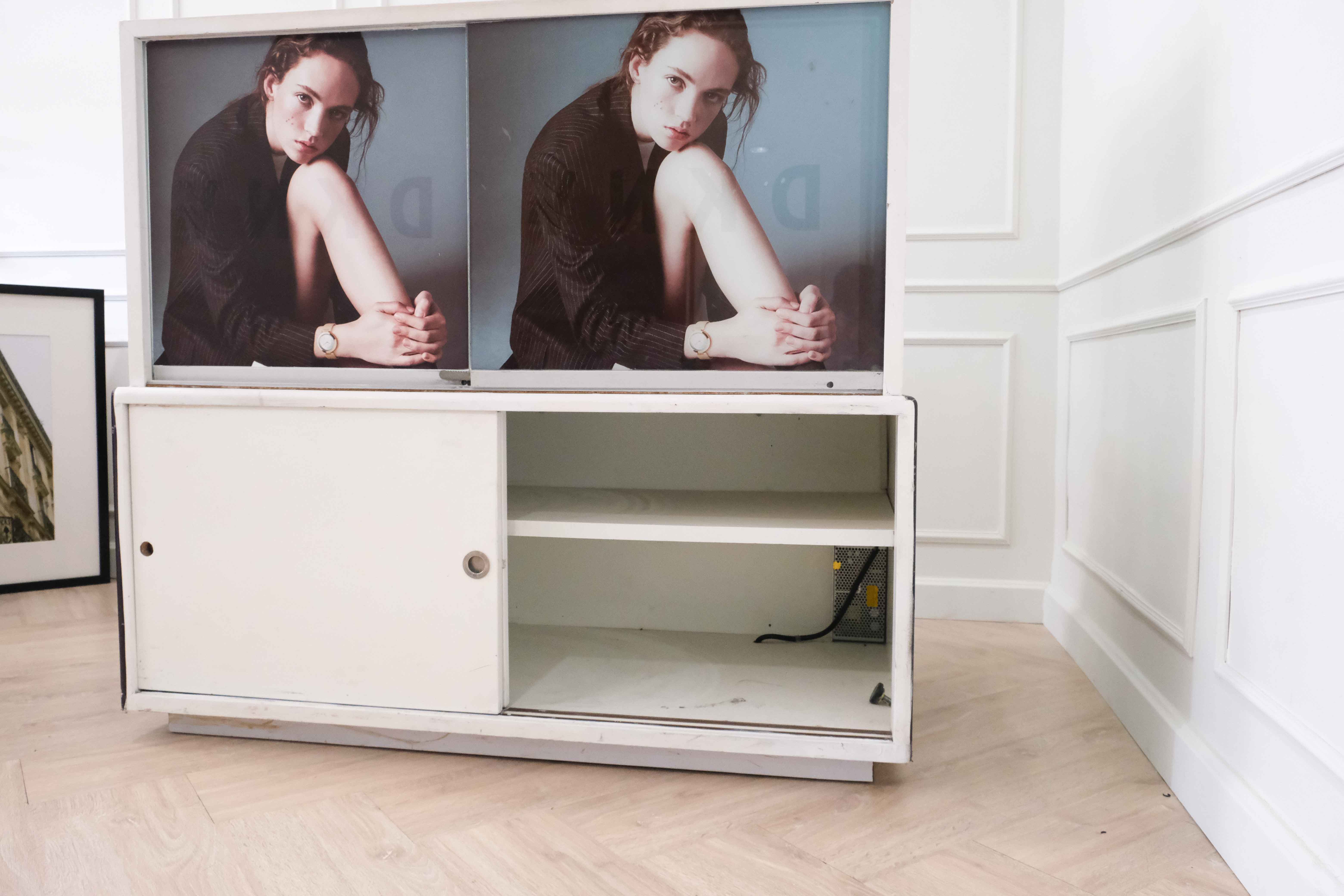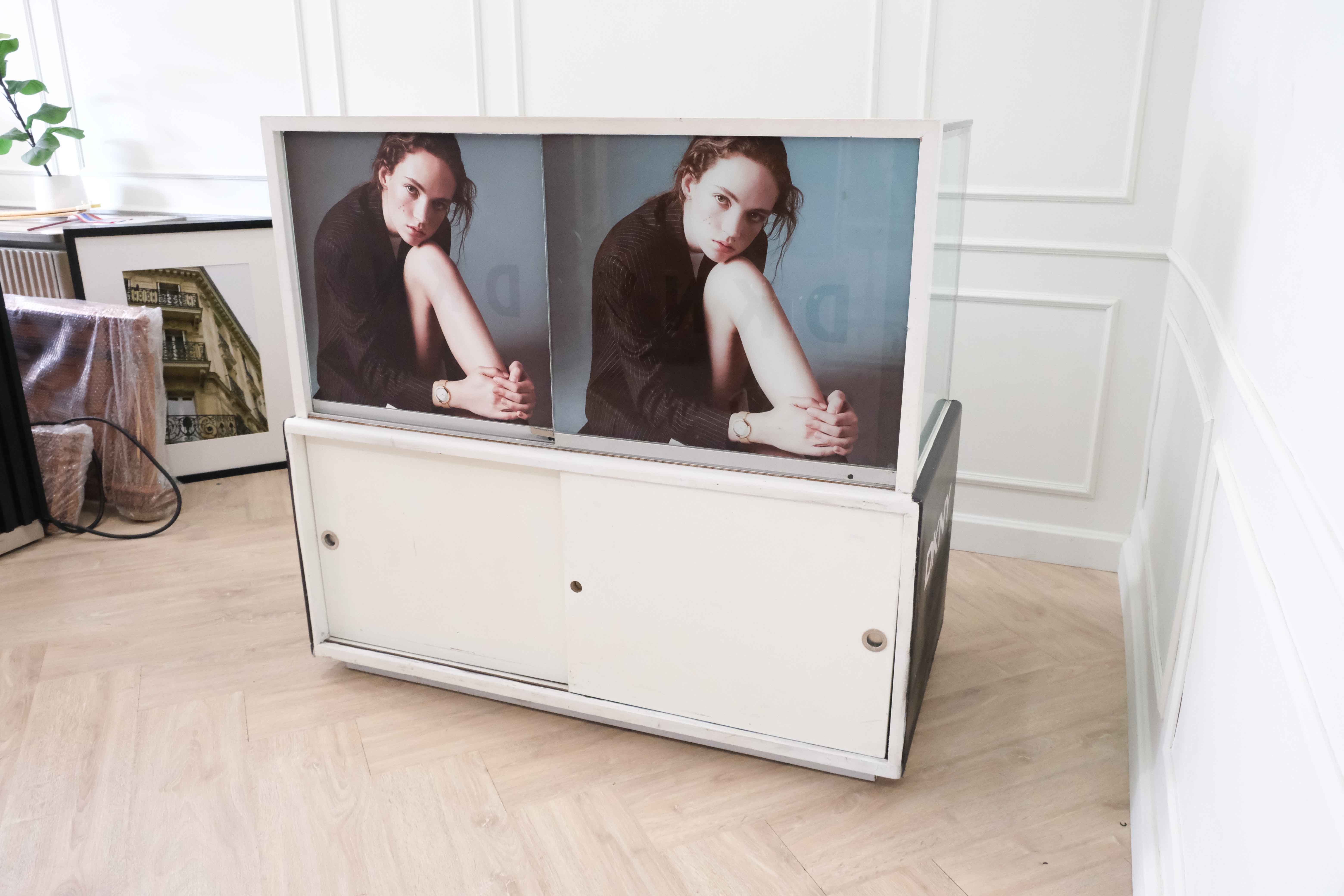 ตู้จิวเวลรี่ ตู้โชว์สินค้ากระจกทรงสี่เหลี่ยมคางหมู มีที่เก็บของด้านล่าง มีล้อ (มี 6 ใบ) *ไม่มีกุญแจ