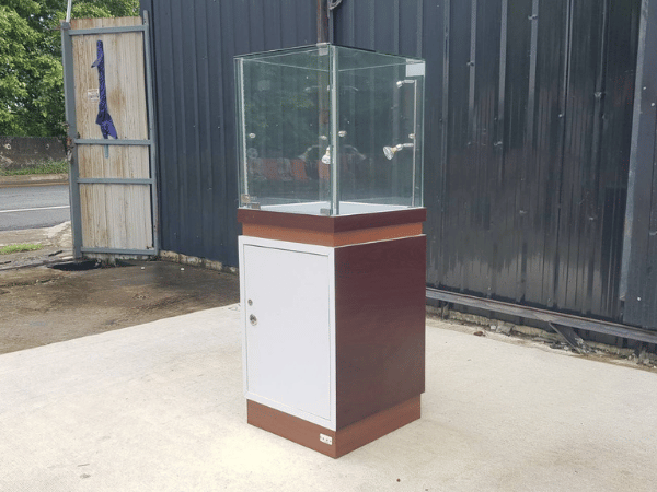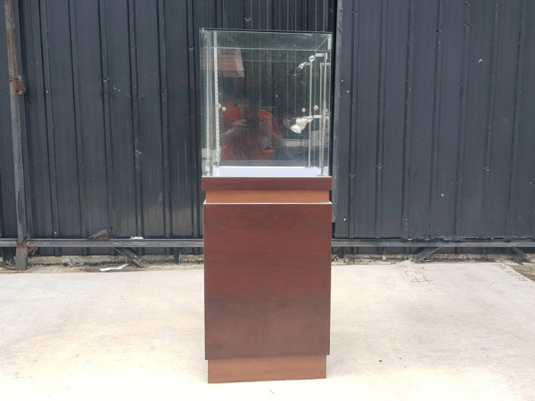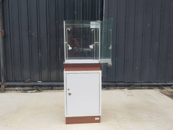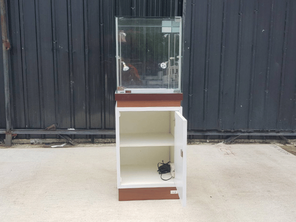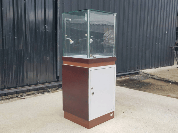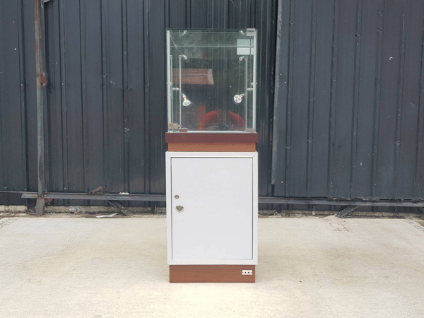ตู้จิวเวลรี่ ตู้โชว์สินค้ากระจกทรงสี่เหลี่ยมคางหมู มีที่เก็บของด้านล่าง มีล้อ (มี 6 ใบ) *ไม่มีกุญแจ