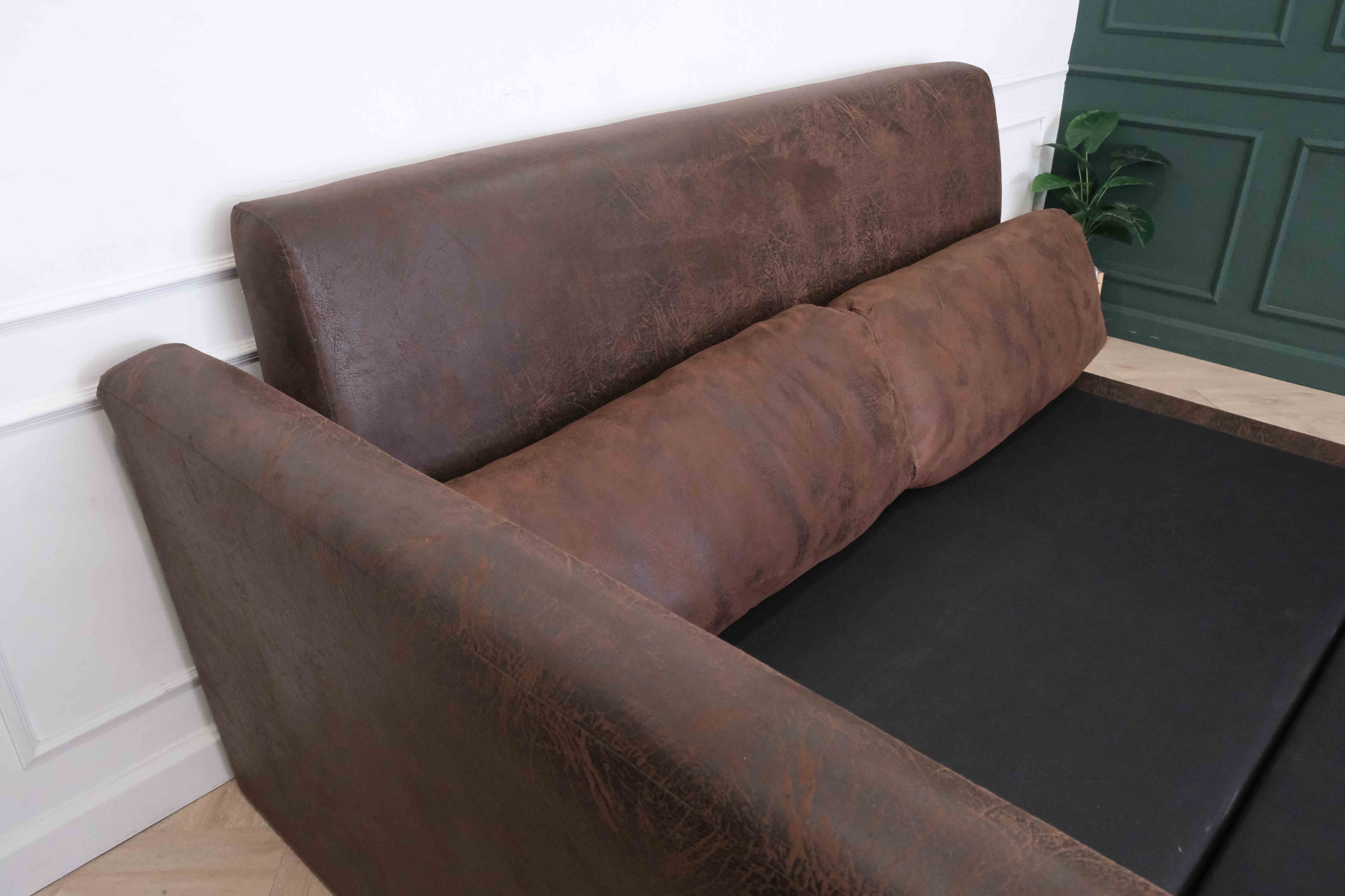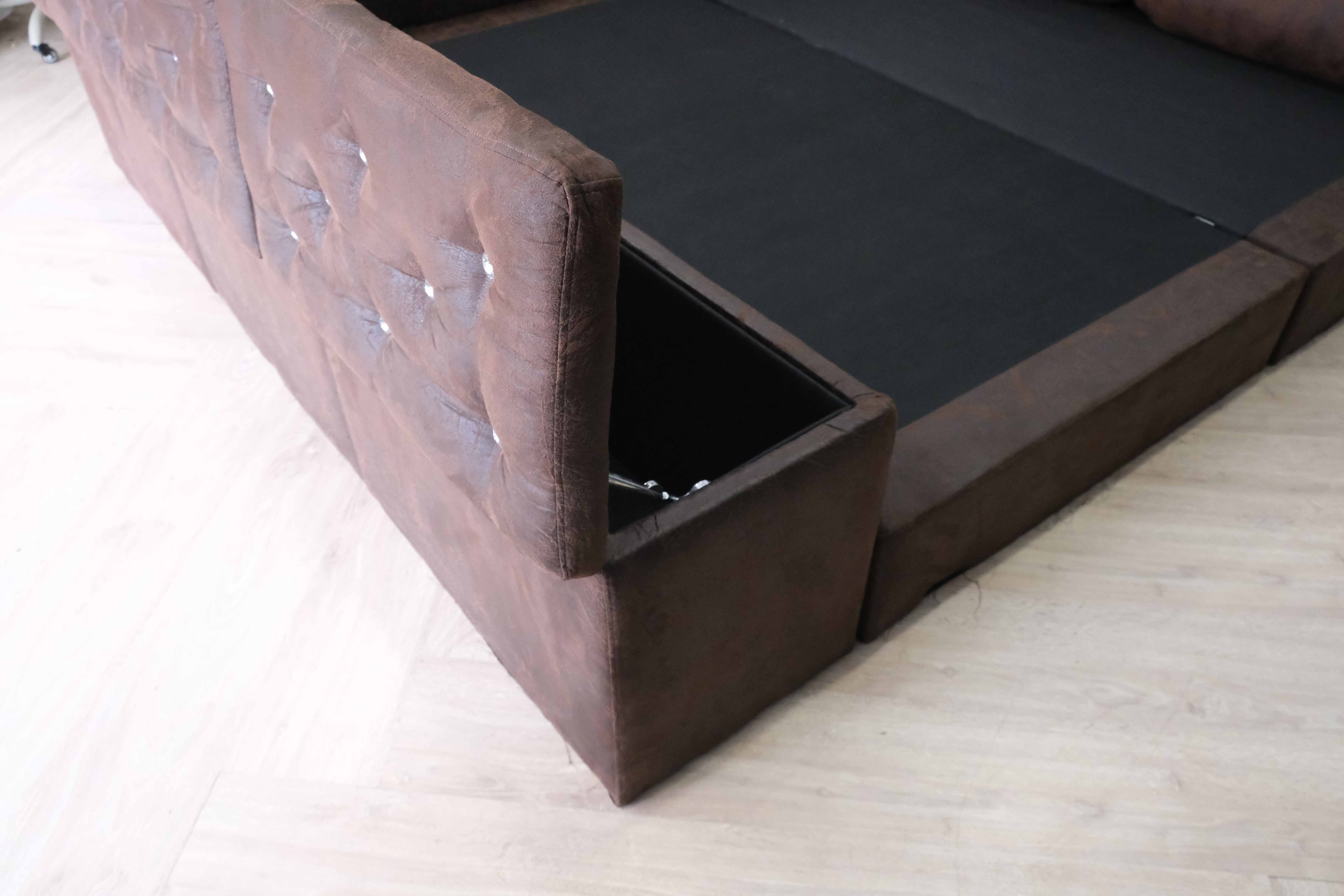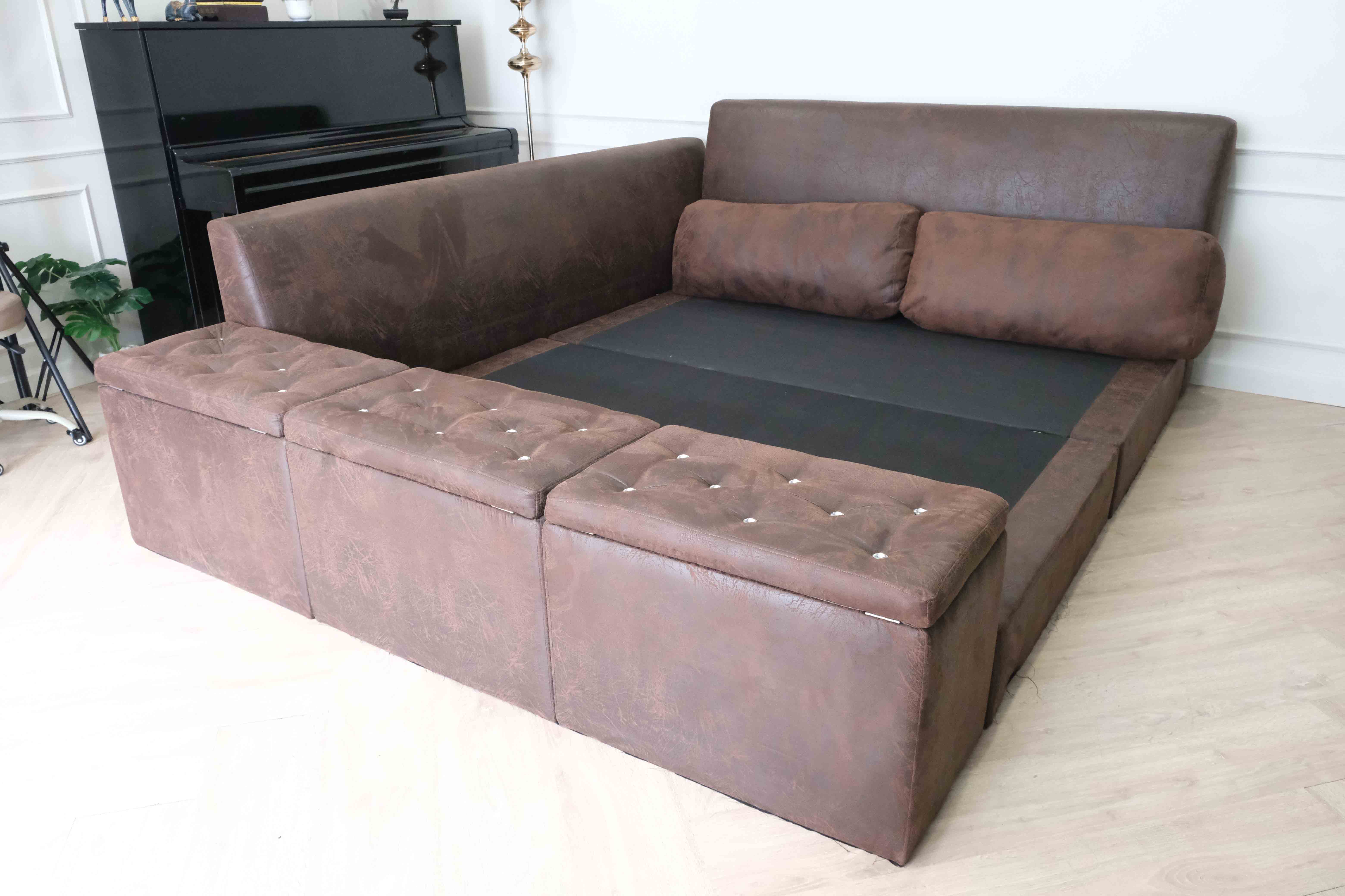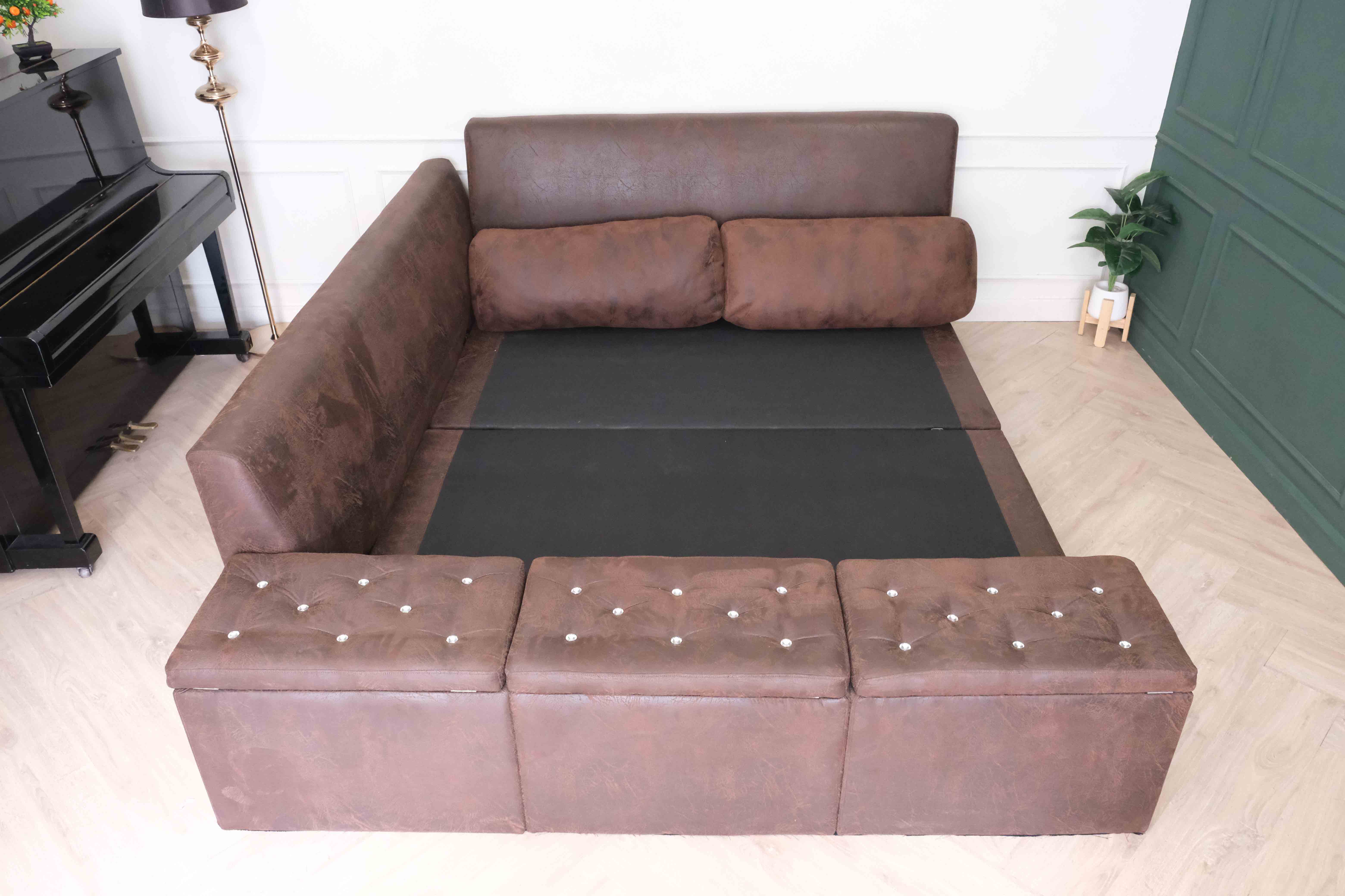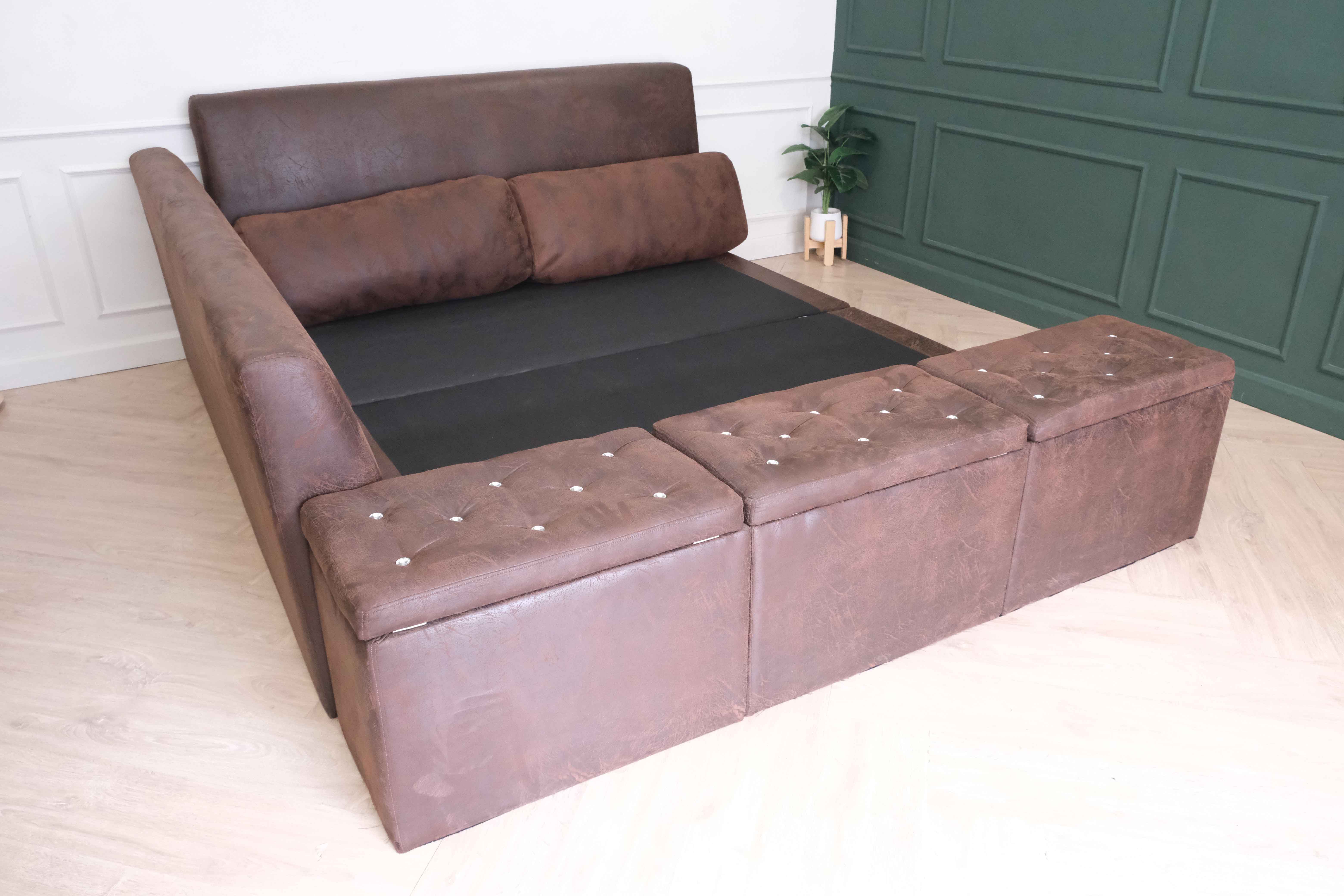 เตียงนอน ผ้าลายหนังสีน้ำตาล ขนาด6ฟุต 3กล่องเก็บของตรงขาเตียง ฝากล่องดึงกระดุมเพชร พร้อมหมอน 2ใบ